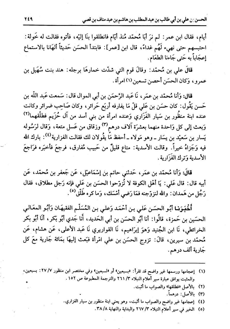 أيام فقال ابن عمر لم نر أبا محمد منذ أيام فانطلقوا بنا إليه فأتوه فقالت له خولة احتبسهم حتى نهئ لهم غداء قال ابن عمر فابتدأ الحسن حديثا الهانا بالاستماع اعجابا به حتى جاءنا الطعام قال علي بن محمد وقال التي شدت خمارها برجله هند بنت سهيل بن عمرو وكان الحسن احصن تسعين (1) امرأة قال وأنا محمد بن عمر نا عبد الرحمن بن أبي الموال قال سمعت عبد الله بن حسن يقول كان حسن بن علي قل ما يفارفه اربه حرائر وكان صاحب ضرائر وكانت عنده ابنة منظور بن سيار الفزاري وعنده امرأة من بني أسد من آل حزيم فطلقهما (2) وبعثت إلى كل واحدة منهما بعشرة آلاف درهم (3) وزقاق من عسل متعة وقال لرسوله يسار بن سعيد بن يسار وهو مولاه احفظ ما يقولان لك فقالت الفزارية (4) : بارك الله فيه وجزاه خيرا وقالت الاسدية متاع قليل من حبيب مفارق فرجع فأخبره فراجع الاسدية وترك الفزارية قال وأنا محمد بن عمر حدثني حاتم بن إسماعيل عن جعفر بن محمد عن أبيه قال قال علي يا أهل الكوفة لا تزوجوا الحسن بن علي فإنه رجل مطلاق فقال رجل من همدان والله لنزوجنه فما رضي امسك وما كره طلق (5)