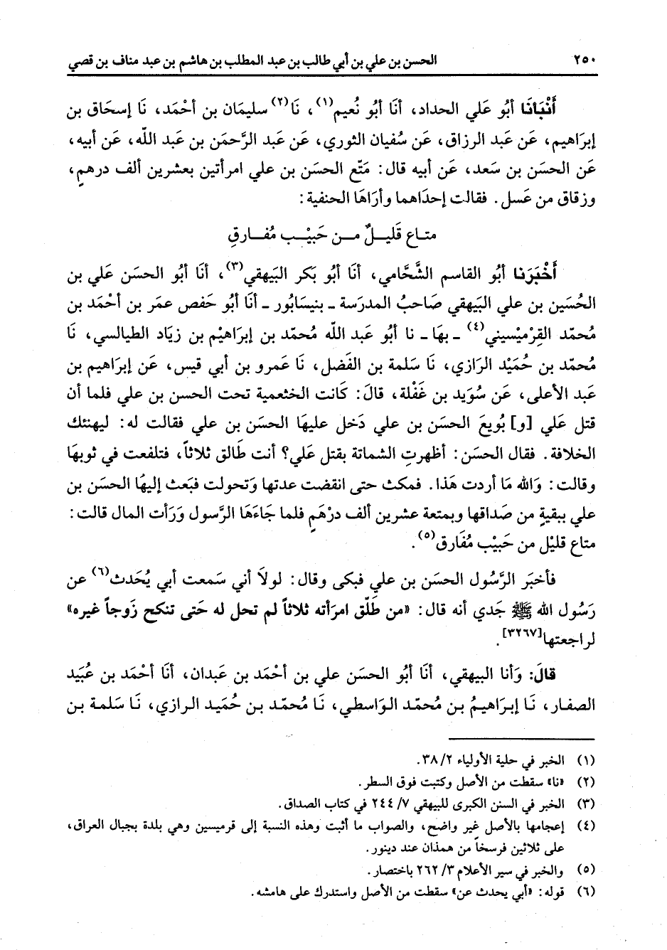 أنبأنا أبو علي الحداد أنا أبو نعيم (1) نا (2) سليمان بن احمد نا إسحاق بن إبراهيم عن عبد الرازق عن سفيان الثوري عن عبد الرحمن بن عبد الله عن أبيه عن الحسن بن سعد عن أبيه قال متع الحسن بن علي امرأتين بعشرين ألف درهم وزقاق من عسل فقالت إحداهما واراها الحنفية * متاع قليل من حبيب مفارق اخبرنا أبو القاسم الشحامي أنا أبو بكر البيهقي (3) أنا أبو الحسن علي بن الحسين بن علي البيهقي صاحب المدرسة بنيسابور أنا أبو حفص عمر بن احمد بن محمد القرميسيني (4) بها نا أبو عبد الله محمد بن إبراهيم بن زياد الطيالسي نا محمد بن حميد الرازي نا سلمة بن الفضل نا عمرو بن أبي قيس عن إبراهيم بن عبد الأعلى عن سويد بن غفلة قال كانت الخثعمية تحت الحسن بن علي فلما أن قتل علي وبويع الحسن بن علي دخل عليها الحسن بن علي فقالت له ليهنئك الخلافة فقال الحسن اظهرت الشماتة بقتل علي أنت طالق ثلاثا فتلفعت في ثوبها وقالت والله ما اردت هذا فمكث حتى انقضت عدتها وتحولت فبعث إليها الحسن بن علي ببقية من صداقها وبمتعة عشرين ألف درهم فلما جاءها الرسول ورأت المال قالت متاع قليل حبيب مفارق (5)