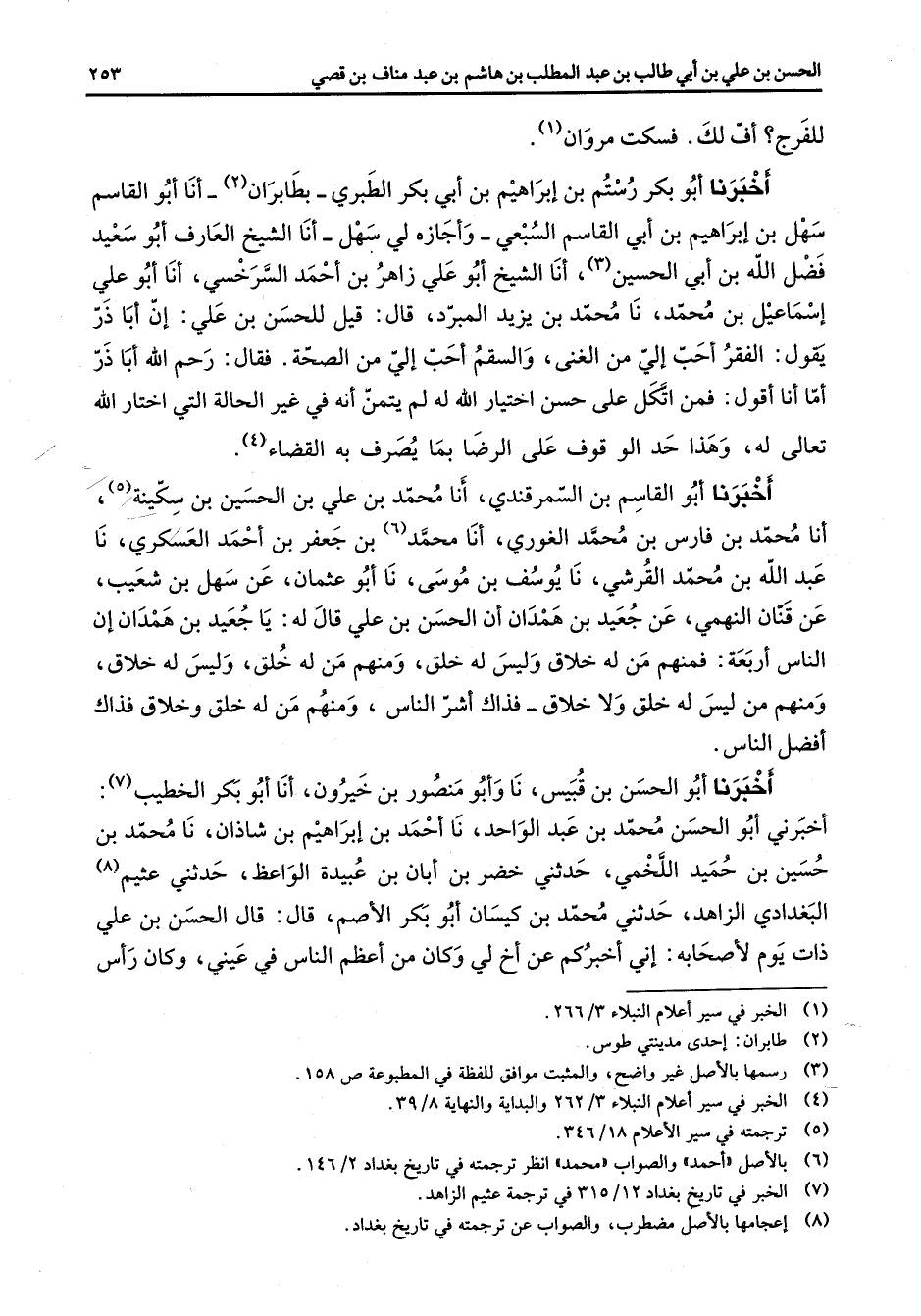 اخبرنا أبو بكر رستم بن إبراهيم بن أبي بكر الطبري بطابران (2) أنا أبو القاسم سهل بن إبراهيم بن أبي القاسم السبعي وأجازه لي سهل أنا الشيخ العارف أبو سعيد فضل الله بن أبي الحسين (3) أنا الشيخ أبو علي زاهر بن احمد السرخسي أنا أبو علي إسماعيل بن محمد نا محمد بن يزيد المبرد قال قيل للحسن بن علي أن أبا ذر يقول الفقر احب الي من الغنى والسقم أحب الي من الصحة فقال رحم الله أبا ذر أما أنا اقول فمن اتكل على حسن اختيار الله له لم يتمن انه في غير الحالة التي اختار الله تعالى له وهذا حد الوقوف على الرضا بما يصرف به القضاء (4)
