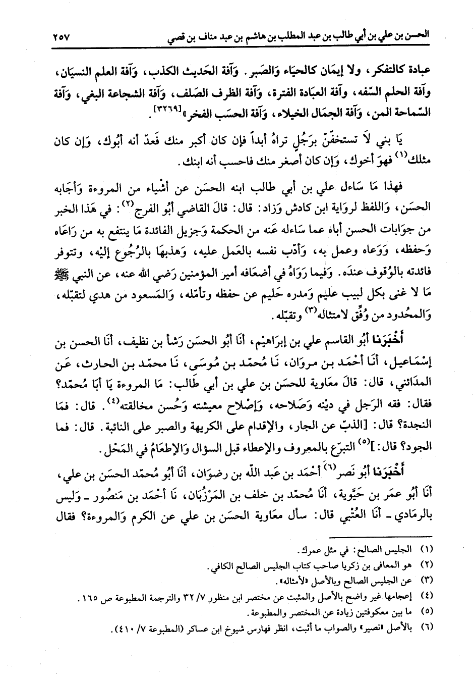 عبادة كالتكفر ولا إيمان كالحياء والصبر وآفة الحديث الكذب وآفة العلم النسيان وآفة الحلم السفه وآفة العبادة الفترة وآفة الظرف الصلف وآفة الشجاعة البغي وآفة السماحة المن وآفة الجمال الخيلاء وآفة الحسب الفخر يا بني لا تستخفن برجل تراه أبدا فإن كان اكبر منك فعد انه ابوك وان كان مثلك (1) فهو اخوك وان كان اصغر منك فاحسب انه ابنك فهذا ما ساءل علي بن أبي طالب ابنه الحسن عن أشياء من المروءة واجابه الحسن واللفظ لرواية ابن كادش وزاد قال قال القاضي أبو الفرج (2) : في هذا الخبر من جوابات الحسن اباه عما ساءله عنه من الحكمة وجزيل الفائدة ما ينتفع به من راعاه وحفظه ووعاه وعمل به وادب نفسه بالعمل عليه وهذبها بالرجوع إليه وتتوفر فائدته بالوقوف عنده وفيما رواه في أضعافه أمير المؤمنين Bهـ عن النبي (صلى الله عليه وسلم) ما لا غنى بكل لبيب عليم ومدره حليم عن حفظه وتأمله والمسعود من هدي لتقبله والمحدود من وفق لامتثاله (3) وتقبله اخبرنا أبو القاسم علي بن إبراهيم أنا أبو الحسن رشأ بن نظيف أنا الحسن بن إسماعيل أنا احمد بن مروان نا محمد بن موسى نا محمد بن الحارث عن المدائني قال قال معاوية للحسن بن علي بن أبي طالب ما المروءة يا أبا محمد فقال فقه الرجل في دينه وصلاحه واصلاح معيشته وحسن مخالقته (4) قال فما النجدة قال الذب عن الجار والإقدام على الكريهة والصبر على النائبة قال فما الجود قال (5) التبرع بالمعروف والاعطاء قبل السؤال والاطعام في المحل اخبرنا أبو نصر (6) احمد بن عبد الله بن رضوان أنا أبو محمد الحسن بن علي أنا أبو عمر بن حيوية أنا محمد بن خلف بن المرزبان نا احمد بن منصور وليس بالرمادي أنا العتبي قال سأل معاوية الحسن بن علي عن الكرم والمروءة فقال