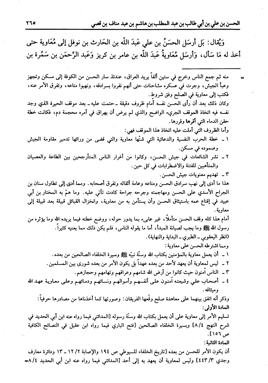 المادة الثانية: أن يكون الامر للحسن من بعده [تاريخ الخلفاء للسيوطي ص 194 والاصابة 2 / 12 - 13 ودائرة معارف وجدي 3 / 443] وليس لمعاوية أن يعهد به إلى أحد [المدائني فيما رواه عنه ابن أبي الحديد 4 / 8