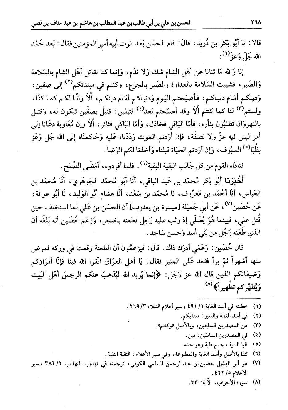 فلما افردوه امضى الصلح اخبرنا أبو بكر محمد بن عبد الباقي أنا أبو محمد الجوهري أنا محمد بن العباس أنا احمد بن معروف نا محمد بن سعد أنا هشام أبو الوليد أنا أبو عوانة عن حصين (7) عن أبي جميلة ميسرة بن يعقوب أن الحسن بن علي لما استخلف حين قتل علي فبينما هو يصلي إذ وثب عليه رجل فطعنه بخنجر وزعم حصين انه بلغه أن الذي طعنه رجل من بني أسد وحسن ساجد قال حصين وعمي ادرك ذاك قال فيزعمون أن الطعنة وقعت في وركه فمرض منها اشهرا ثم برأ فقعد على المنبر فقال يا أهل العراق اتقوا الله فينا فأنا أمراؤكم وضيفانكم الذين قال الله عز وجل " إنما يريد الله ليذهب عنكم الرجس أهل البيت ويطهركم تطهيرا " (8)