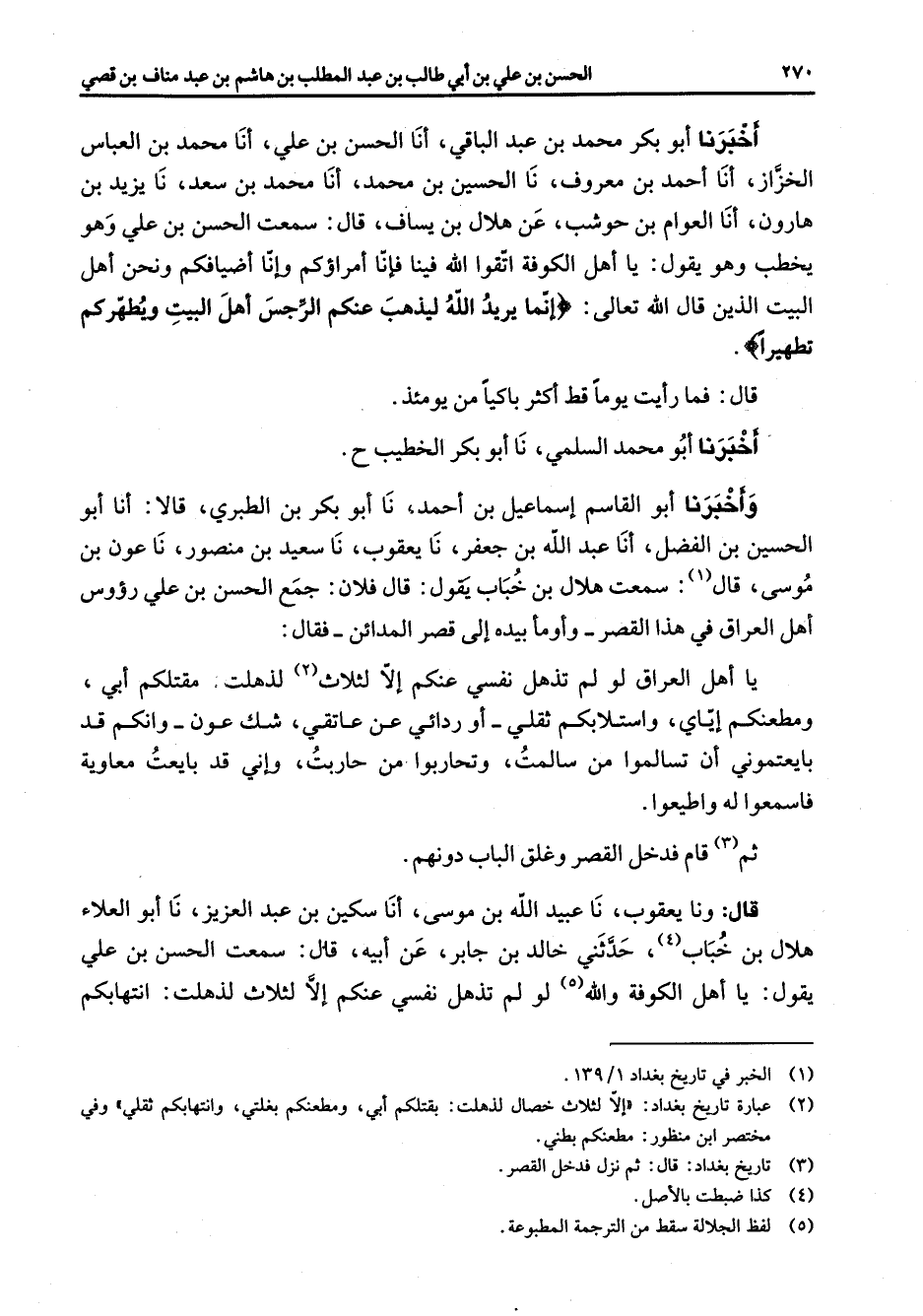 (2) عبارة تاريخ بغداد: " إلا لثلاث خصال لذهلت: بقتلكم أبي ومطعنكم بغلتي وانتهابكم ثقلي " وفي مختصر ابن منظور: مطعنكم بطني