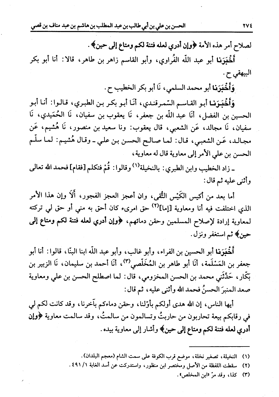 لصلاح أمر هذه الأمة " وان ادري لعله فتنة لكم ومتاع إلى حين " اخبرنا أبو عبد الله الفراوي وأبو القاسم زاهر بن طاهر قالا أنا أبو بكر البيهقي ح واخبرنا أبو محمد السلمي نا أبو بكر الخطيب واخبرنا أبو القاسم السمرقندي أنا أبو بكر بن الطبري قالوا أنا أبو الحسين بن الفضل أنا عبد الله بن جعفر نا يعقوب بن سفيان نا الحميدي نا سفيان نا مجالد عن الشعبي قال يعقوب وان سعيد بن منصور نا هشيم عن مجالد عن الشعبي قال لما صالح الحسن بن علي وقال هشيم لما سلم الحسن بن علي الأمر إلى معاوية قال له معاوية زاد الخطيب وابن الطبري بالنخيلة (1) وقالوا قم فتكلم فقام فحمد الله تعالى واثنى عليه ثم قال أما بعد من اكيس الكيس التقي وان اعجز العجز الفجور إلا وان هذا الأمر الذي اختلفت فيه أنا ومعاوية أما (2) حق امرئ كان احق به مني أو حق لي تركته لمعاوية إرادة لاصلاح المسلمين وحقن دمائهم " وان ادري لعله فتنة لكم ومتاع إلى حين " ثم استغفر ونزل اخبرنا أبو الحسين بن الفراء وأبو غالب وأبو عبد الله ابنا البنا قالوا أنا أبو جعفر بن المسلمة أنا أبو طاهر بن المخلصي (3) أنا احمد بن سليمان نا الزبير بن بكار حدثني محمد بن الحسن المخزومي قال لما اصطلح الحسن بن علي ومعاوية صعد المنبر الحسن فحمد الله واثنى عليه ثم قال آيها الناس أن الله هدى أو لكم بأولنا وحقن دماءكم باخرنا وقد كانت لكم لي في رقابكم بيعة تحاربون من حاربت وتسالمون من سالمت وقد سالمت معاوية " وان ادري لعله فتنة لكم ومتاع إلى حين " واشار إلى معاوية بيده