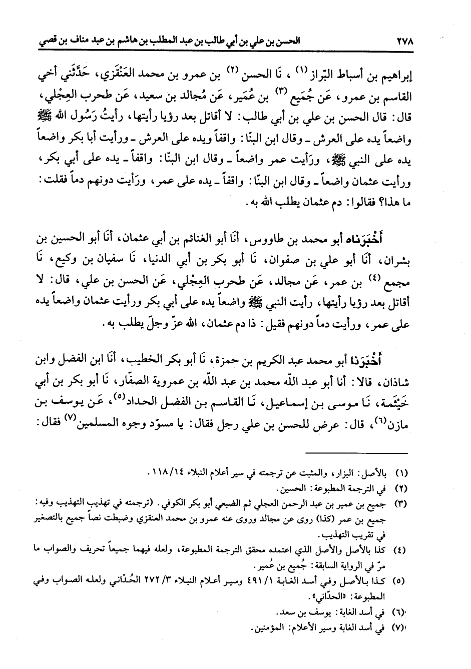 إبراهيم بن اسباط البراز (1) نا الحسن (2) بن عمرو بن محمد العنقزي حدثني اخي القاسم بن عمرو عن جميع (3) بن عمير عن مجالد بن سعيد عن طحرب العجلي قال قال الحسن بن علي بن أبي طالب لا اقاتل بعد رؤيا رايتها رأيت رسول الله (صلى الله عليه وسلم) واضعا يده على العرش وقال ابن البنا واقفا ويده على العرش ورأيت أبا بكر واضعا يده على النبي (صلى الله عليه وسلم) ورأيت عمر واضعا وقال ابن البنا واقفا يده على أبي بكر ورأيت عثمان واضعا وقال ابن البنا واقفا يده على عمر ورأيت دونهم دما فقلت ما هذا فقالوا دم عثمان يطلب الله به أخبرناه أبو محمد بن طاووس أنا أبو الغنائم بن أبي عثمان أنا أبو الحسين بن بشران أنا أبو علي بن صفوان نا أبو بكر بن أبي الدنيا نا سفيان بن وكيع نا مجمع (4) بن عمر عن مجالد عن طحرب العجلي عن الحسن بن علي قال لا اقاتل بعد رؤيا رأيتها رأيت النبي (صلى الله عليه وسلم) واضعا يده على أبي بكر ورأيت عثمان واضعا يده على عمر ورأيت دما دونهم فقيل ذا دم عثمان الله عز وجل يطلب به اخبرنا أبو محمد عبد الكريم بن حمزة نا أبو بكر الخطيب أنا ابن الفضل وابن شاذان قالا نا أبو عبد الله محمد بن عبد الله بن عمروية الصفار نا أبو بكر بن أبي خيثمة نا موسى بن إسماعيل نا القاسم بن الفضل الحداد (5) عن يوسف بن مازن (6) قال عرض للحسن بن علي رجل فقال يا مسود وجوه المسلمين (7) فقال