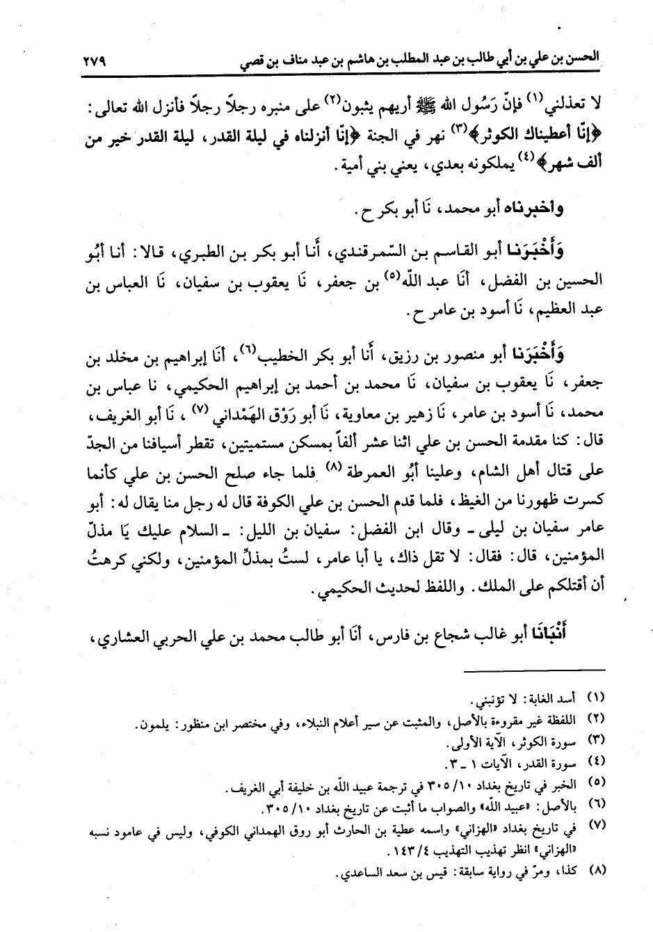 لا تعذلني (1) فان رسول الله (صلى الله عليه وسلم) اريهم يبثون (2) على منبره رجلا رجلا فانزل الله تعالى " أنا اعطيناك الكوثر " (3) نهر في الجنة أنا انزلناه في ليلة القدر ليلة القدر خير من ألف شهر " (4) يملكونه بعدي يعني بني أمية واخبرناه أبو محمد نا أبو بكر واخبرناه أبو القاسم بن السمرقندي أنا أبو بكر بن الطبري قالا أنا أبو الحسين بن الفضل أنا عبد الله (5) بن جعفر نا يعقوب بن سفيان نا العباس بن عبد العظيم نا اسود بن عامر واخبرنا أبو منصور بن زريق أنا أبو بكر الخطيب (6) أنا إبراهيم بن مخلد بن جعفر نا يعقوب بن سفيان نا محمد بن احمد بن إبراهيم الحكيمي نا عباس بن محمد نا اسود بن عامر نا زهير بن معاوية نا أبو روق الهمداني (7) نا أبو الغريف قال كنا مقدمة الحسن بن علي اثنا عشر آلفا بمسكن مستميتين تقطر اسيافنا من الجد على قتال أهل الشام وعلينا أبو العمرطة (8) فلما جاء صلح الحسن بن علي كأنما كسرت ظهورنا من الغيظ فلما قدم الحسن بن علي الكوفة قال له رجل منا يقال له أبو عامر سفيان بن ليلى وقال ابن الفضل سفيان بن الليل السلام عليك يا مذل المؤمنين قال فقال لا تقل ذاك يا أبا عامر لست بمذل المؤمنين ولكني كرهت أن اقتلكم على الملك واللفظ لحديث الحكيمي أنبأنا أبو غالب شجاع بن فارس أنا أبو طالب محمد بن علي الحربي العشاري " " "