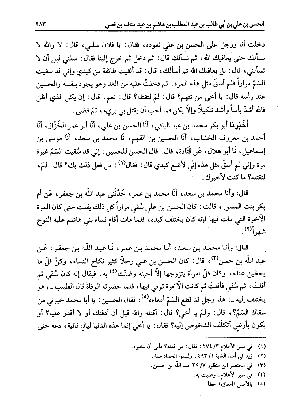 دخلت أنا ورجل على الحسن بن علي نعوده فقال يا فلان سلني قال لا والله لا نسألك حتى يعافيك الله ثم نسألك قال ثم دخل ثم خرج إلينا فقال سلني قبل أن لا تسألني قال بل يعافيك الله ثم أسألك قال قد القيت طائفة من كبدي واني قد سقيت السم مرارا فلم اسق مثل هذه المرة ثم دخلت عليه من الغد وهو يجود بنفسه والحسين عند رأسه قال يا اخي من تتهم قال لم لتقتله قال نعم قال أن يكن الذي اظن فالله اشد بأسا واشد تنكيلا وألا يكن فما احب أن يقتل بي برئ ثم قضى اخبرنا أبو بكر محمد بن عبد الباقي أنا الحسن بن علي أنا أبو عمر الخزاز أنا احمد بن معروف الخشاب أنا الحسين بن الفهم نا محمد بن سعد أنا موسى بن إسماعيل نا أبو هلال عن قتادة قال قال الحسن للحسين أني قد سقيت السم غيرة مرة واني لم اسق مثل هذه أني لأضع كبدي قال فقال (1) : من فعل ذلك بك قال لم لتقتله ما كنت لأخبرك قال وأنا محمد بن سعد أنا محمد بن عمر حدثني عبد الله بن جعفر عن أم بكر بنت المسور قالت كان الحسن بن علي سقي مرارا كل ذلك يفلت حتى كان المرة الآخرة التي مات فيها فإنه كان يختلف كبده فلما مات اقام نساء بني هاشم عليه النوح شهرا (2) قال وأنا محمد بن سعد أنا محمد بن عمر نا عبد الله بن جعفر عن عبد الله بن حسن (3) قال كان الحسن بن علي رجلا كثير نكاح النساء وكن اقل ما يحظين عنده وكان قل امرأة يتزوجها إلا احبته وضنت (4) به فيقال انه كان سقي ثم افلت ثم سقي فافلت ثم كانت الآخرة توفي فيها فلما حضرته الوفاة قال الطبيب وهو يختلف إليه هذا رجل قد قطع السم امعاءه (5) فقال الحسين يا أبا محمد خبرني من سقاك السم قال ولم يا اخي قال اقتله والله قبل أن ادفنك أو لا اقدر عليه أو يكون بأرض اتكلف الشخوص إليه فقال يا اخي إنما هذه الدنيا ليال فانية دعه حتى
