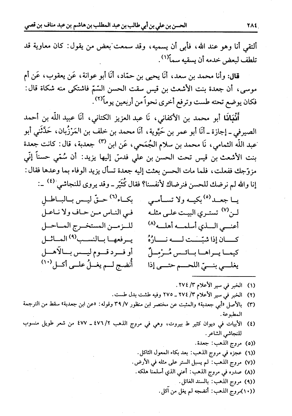 قال وأنا محمد بن سعد أنا يحيى بن حماد أنا أبو عوانة عن يعقوب عن أم موسى أن جعدة بنت الاشعت بن قيس سقت الحسن السم فاشتكى منه شكاة قال فكان يوضع تحته طست وترفع أخرى نحوا من أربعين يوما (2) أنبأنا أبو محمد بن الأكفاني نا عبد العزيز الكتاني أنا عبيد الله بن احمد الصيرفي اجازة أنا أبو عمر بن حيوية أنا محمد بن خلف بن المرزبان حدثني أبو عبد الله الثمامي نا محمد بن سلام الجمحي عن ابن (3) جعدبة قال كانت جعدة بنت الأشعت بن قيس تحت الحسن بن علي فدس إليها يزيد أن سمي حسنا أني مزوجك ففعلت فلما مات الحسن بعثت إليه جعدة تسأل يزيد الوفاء بما وعدها فقال أنا والله ولم نرضك للحسن فنرضاك لانفسنا فقال كثير وقد يروي للنجاشي (4) * يا جعد (5) بكيه ولا تسأمي * بكاء (6) حق ليس بالباطل لن (7) تستري البيت على مثله * في الناس من حاف ولا ناعل اعني الذي اسلمه أهله (8) * للزمن المستخرج الماحل كان إذا شبت له ناره * يرفعها بالنسب (9) الماثل كيما يراها بائس مرمل * أو فرد قوم ليس بالاهل يغلي بني اللحم حتى إذا * انضج لم يغل على آكل (10) *