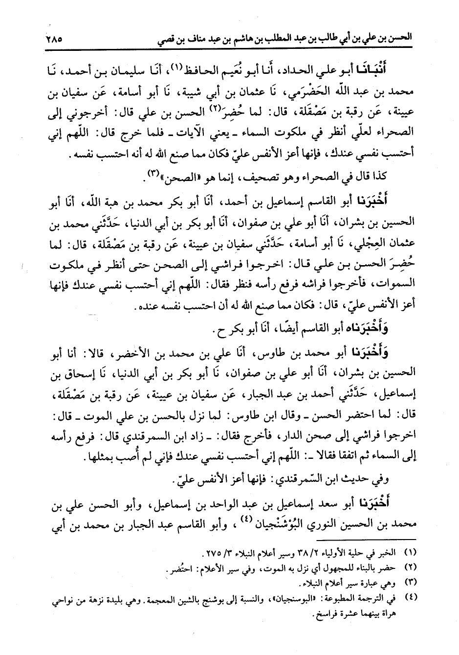 أنبأنا أبو علي الحداد أنا أبو نعيم الحافظ (1) أنا سليمان بن احمد نا محمد بن عبد الله الحضرمي نا عثمان بن أبي شيبة نا أبو أسامة عن سفيان بن عيينة عن رقبة بن مصقلة قال لما حضر (2) الحسن بن علي قال أخرجوني إلى الصحراء لعلي انظر في ملكوت السماء يعني الآيات فلما خرج قال اللهم أني احتسب نفسي عندك فإنها اعز الانفس علي فكان مما صنع الله له انه احتسب نفسه كذا قال في الصحراء وهو تصحيف إنما هو الصحن (3)
