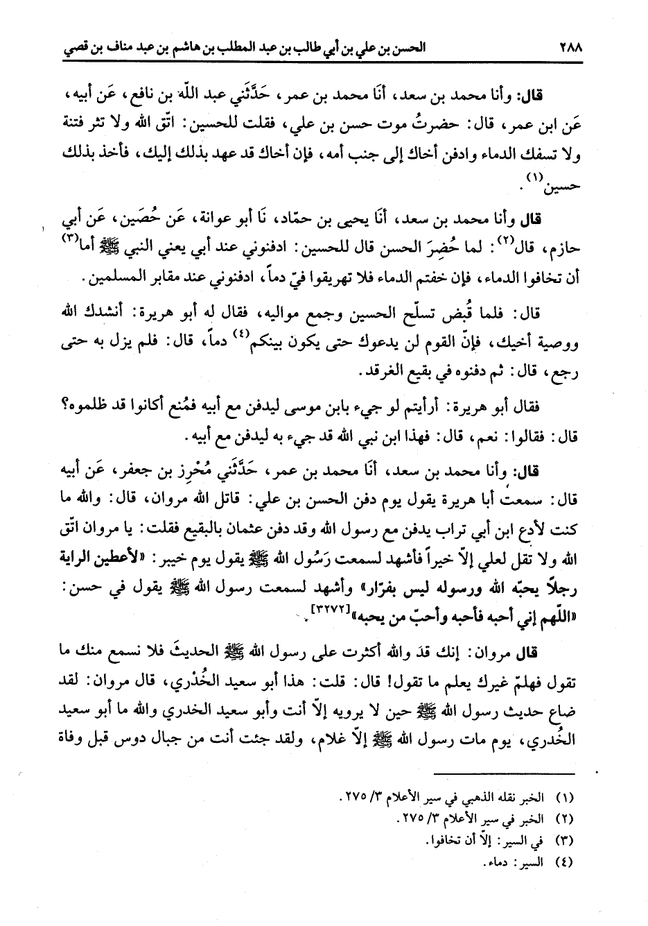 قال وأنا محمد بن سعد إنا يحيى بن حماد نا أبو عوانة عن حصين عن أبي حازم قال (2) : لما حضر الحسن قال للحسين ادفنوني عند أبي يعني النبي (صلى الله عليه وسلم) أما (3) أن تخافوا الدماء فإن خفتم الدماء فلا تهريقوا في دما ادفنوني عند مقابر المسلمين قال فلما قبض تسلح الحسين وجمع مواليه فقال له أبو هريرة انشدك الله ووصية اخيك فإن القوم لن يدعك حتى يكون بينكم (4) دما قال فلم يزل به حتى رجع قال ثم دفنوه في بقيع الغرقد فقال أبو هريرة ارايتم لو جئ بابن موسى ليدفن مع أبيه فمنع اكانوا قد ظلموه قال فقالوا نعم قال فهذا ابن نبي الله قد جئ به ليدفن مع أبيه قال وأنا محمد بن سعد أنا محمد بن عمر حدثني محرز بن جعفر عن أبيه قال سمعت أبا هريرة يقول يوم دفن الحسن بن علي قاتل الله مروان قال والله ما كنت لأدع ابن أبي تراب يدفن مع رسول الله وقد دفن عثمان بالبقيع فقلت يا مروان اتق الله ولا تقل لعلي إلا خيرا فأشهد لسمعت رسول الله (صلى الله عليه وسلم) يقول يوم خيبر لاعطين الراية رجلا يحبه الله ورسوله ليس بفرار واشهد لسمعت رسول الله (صلى الله عليه وسلم) يقول في حسن اللهم أني احبه فأحبه واحب من يحبه قال مروان انك والله اكثرت على رسول الله (صلى الله عليه وسلم) الحديث فلا نسمع منك ما تقول فهلم غيرك يعلم ما تقول قال قلت هذا أبو سعيد الخدري قال مروان لقد ضاع حديث رسول الله (صلى الله عليه وسلم) حين لا يرويه إلا أنت وأبو سعيد الخدري والله ما أبو سعيد الخدري يوم مات رسول الله (صلى الله عليه وسلم) إلا غلام ولقد جئت أنت من جبال دوس قبل وفاة