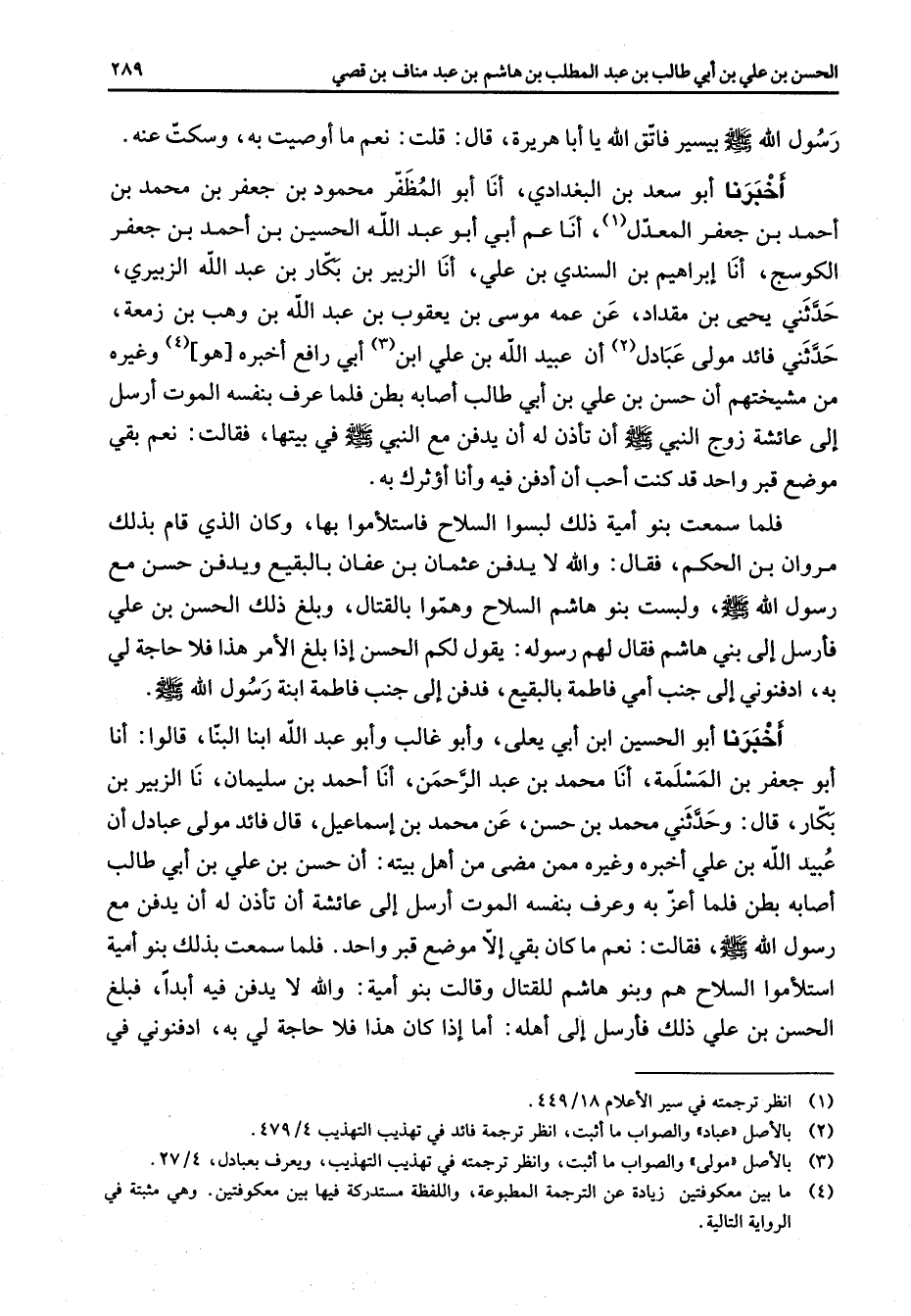 رسول الله (صلى الله عليه وسلم) بيسير فاتق الله يا أبا هريرة قال قلت نعم ما اوصيت به وسكت عنه اخبرنا أبو سعد بن البغدادي أنا أبو المظفر محمود بن جعفر بن محمد بن احمد بن جعفر المعدل (1) أنا عم أبي أبو عبد الله الحسين بن احمد بن جعفر الكوسج أنا إبراهيم بن السندي بن علي أنا الزبير بن بكار بن عبد الله الزبيري حدثني يحيى بن مقداد عنه عمه موسى بن يعقوب بن عبد الله بن وهب بن زمعة حدثني فائد مولى عبادل (2) أن عبيد الله بن علي ابن (3) أبي رافع اخبره هو (4) وغيره من مشيختهم أن حسن بن علي بن أبي طالب أصابه بطن فلما عرف بنفسه الموت أرسل إلى عائشة زوج النبي (صلى الله عليه وسلم) أن تأذن له أن يدفن مع النبي (صلى الله عليه وسلم) في بيتها فقالت نعم بقي موضع قبر واحد قد كنت احب أن ادفن فيه وأنا اؤثرك به فلما سمعت بنو أمية ذلك لبسوا السلاح فاستلأموا بها وكان الذي قام بذلك مروان بن الحكم فقال والله لا يدفن عثمان بن عفان بالبقيع ويدفن حسن مع رسول الله (صلى الله عليه وسلم) ولبست بنو هاشم السلاح وهموا بالقتال وبلغ ذلك الحسن بن علي فأرسل إلى بني هاشم فقال لهم رسوله يقول لكم الحسن إذا بلغ الأمر هذا فلا حاجة لي به ادفنوني إلى جنب أمي فاطمة بالبقيع فدفن إلى جنب فاطمة ابنة رسول الله (صلى الله عليه وسلم) اخبرنا أبو الحسن بن أبي يعلي وأبو غالب وأبو عبد الله ابنا البنا قالوا أنا أبو جعفر بن المسلمة أنا محمد بن عبد الرحمن أنا احمد بن سليمان نا الزبير بن بكار قال وحدثني محمد بن حسن عن محمد بن إسماعيل قال فائد مولى عبادل أن عبيد الله بن علي اخبره وغيره ممن مضى من أهل بيته أن حسن بن علي بن أبي طالب أصابه بطن فلما اعز وعرف بنفسه الموت أرسل إلى عائشة أن تأذن له أن يدفن مع رسول الله (صلى الله عليه وسلم) فقالت نعم ما كان بقي إلا موضع قبر واحد فلما سمعت بذلك بنو أمية استلأموا السلاح هم وبنو هاشم للقتال وقالت بنو أمية والله لا يدفن فيه أبدا فبلغ الحسن بن علي ذلك فأرسل إلى أهله أما إذا كان هذا فلا حاجة لي به ادفنوني في