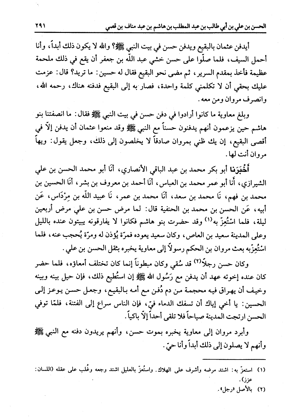 ايدفن عثمان بالبقيع ويدفن حسن في بيت النبي (صلى الله عليه وسلم) والله لا يكون ذلك أبدا وأنا احمل السيف فلما صلوا على حسن خشي عبد الله بن جعفر أن يقع في ذلك ملحمة عظيمة فأخذ بمقدم السرير ثم مضى نحو البقيع فقال له حسين ما تريد قال عزمت عليك بحقي أن لا تكلمني كلمة واحدة فصار به إلى البقيع فدفنه هناك رحمه الله وانصرف مروان ومن معه وبلغ معاوية ما كانوا أرادوا في دفن حسن في بيت النبي (صلى الله عليه وسلم) فقال ما انصفتنا بنو هاشم حين يزعمون انهم يدفنون حسنا مع النبي (صلى الله عليه وسلم) وقد منعوا عثمان أن يدفن إلا في اقصى البقيع أن يك ظني بمروان صادقا لا يخلصون إلى ذلك وجعل يقول ويها مروان أنت لها اخبرنا أبو بكر محمد بن عبد الباقي الأنصاري أنا أبو محمد الحسن بن علي الشيرازي أنا أبو عمر محمد بن العباس أنا احمد بن معروف بن بشر أنا الحسين بن محمد بن فهم نا محمد بن سعد أنا محمد بن عمر نا عبيد الله بن مرداس عن أبيه عن الحسن بن محمد بن الحنفية قال لما مرض حسن بن علي مرض أربعين ليلة فلما استعز (1) به وقد حضرت بنو هاشم فكانوا لا يفارقونه يبيتون عنده بالليل وعلى المدينة سعيد بن العاص وكان سعيد يعوده فمره يؤذن له ومرة يحجب عنه فلما استعز به بعث مروان بن الحكم رسولا إلى معاوية يخبره بثقل الحسن بن علي وكان حسن رجلا (2) قد سقي وكان مبطونا إنما كان تختلف امعاؤه فلما حضر كان عنده اخوته عهد أن يدفن مع رسول الله (صلى الله عليه وسلم) أن استطيع ذلك فإن حيل بينه وبينه وخيف أن يهراق فيه محجمة من دم دفن مع امه بالبقيع وجعل حسن يوعز إلى الحسين يا اخي اياك أن تسفك الدماء في فإن الناس سراع إلى الفتنة فلما توفي الحسن ارتجت المدينة صياحا فلا تلقى احدا إلا باكيا وابرد مروان إلى معاوية يخبره بموت حسن وانهم يريدون دفنه مع النبي (صلى الله عليه وسلم) وانهم لا يصلون إلى ذلك أبدا وأنا حي