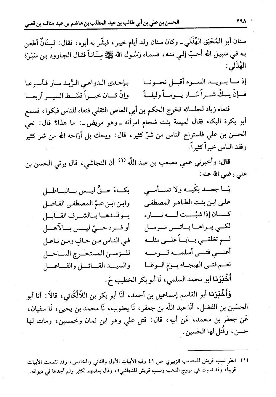 سنان أبو المحبق الهذلي وكان سنان ولد أيام خيبر فبشربه أبوه فقال لسنان اطعن به في سبيل الله احب الي منه فسماه رسول الله (صلى الله عليه وسلم) سنانا فقال الجارود بن سبرة الهذلي * إذ ما بريد السوء اقبل نحونا * بإحدى الدواهي الربد سار فأسرعا * * فان يك شرا سار يوما وليلة * وان كان خيرا قسط السير أربعا * فنعاه زياد لجلسائه فخرج الحكم بن أبي العاص الثقفي فنعاه للناس فبكوا فسمع أبو بكرة البكاء فقال لميسة بنت شحام امرأته وهو مريض ما هذا قال نعي الحسن بن علي فاستراح الناس من شر كثير قال ويحك بل اراحه الله من شر كثير وفقد الناس خيرا كثيرا قال واخبرني عمي مصعب بن عبد الله (1) أن النجاشي قال يرثي الحسن بن علي Bهـ * يا جعد بكيه ولا تسأمي * بكاء حق ليس بالباطل عن ابن بنت الطاهر المصطفى * وابن ابن عم المصطفى الفاضل كان إذا شبت له ناره * يوقدها بالشرف القابل لكي يراها بائس مرمل * أو فرد حي ليس بالآهل لم تغلقي بابا على مثله * في الناس من حاف ومن ناعل اعني فتى أسلمه قومه * للزمن المستحرج الماحل نعم فتى الهيجاء يوم الوغا * والسيد القائل والفاعل * اخبرنا أبو محمد السلمي نا أبو بكر الخطيب واخبرنا أبو القاسم إسماعيل بن احمد أنا أبو بكر بن اللالكائي قالا أنا أبو الحسين بن الفضل أنا عبد الله بن جعفر نا يعقوب نا محمد بن يحيى نا سفيان عن جعفر بن محمد عن أبيه قال قتل علي وهو ابن ثمان وخمسين ومات لها حسن وقتل لها الحسين