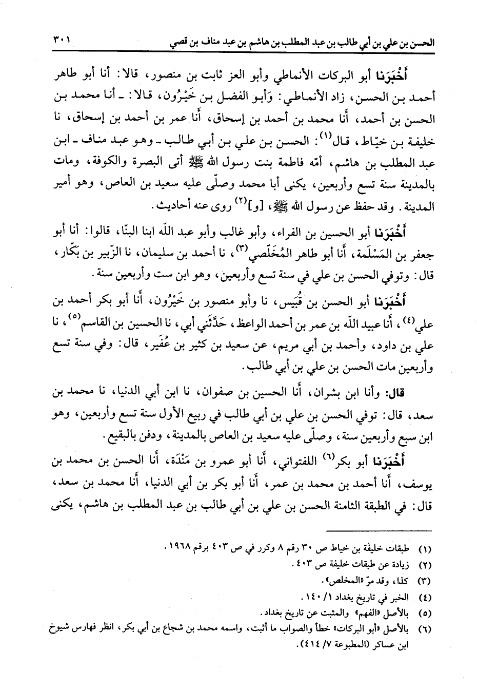 اخبرنا أبو البركات الانماطي وأبو العز ثابت بن منصور قالا أنا أبو طاهر احمد بن الحسن زاد الانماطي وأبو الفضل بن خيرون قالا أنا محمد بن الحسن بن احمد أنا محمد بن احمد بن إسحاق أنا عمر بن احمد بن إسحاق نا خليفة بن خياط قال (1) : الحسن بن علي بن أبي طالب وهو عبد مناف ابن عبد المطلب بن هاشم أمة فاطمة بنت رسول الله (صلى الله عليه وسلم) أتى البصرة والكوفة ومات بالمدينة سنة تسع واربعين يكنى أبا محمد وصلى عليه سعيد بن العاص وهو أمير المدينة وقد حفظ عن رسول الله (صلى الله عليه وسلم) (و) (2) روى عنه أحاديث اخبرنا أبو الحسين بن الفراء وأبو غالب وأبو عبد الله ابنا البنا قالوا أنا أبو جعفر بن المسلمة أنا أبو طاهر المخلصي (3) نا احمد بن سليمان نا الزبير بن بكار قال وتوفي الحسن بن علي في سنة تسع واربعين وهو ابن ست واربعين سنة اخبرنا أبو الحسن بن قبيس نا وأبو منصور أنا أبو بكر احمد بن علي (4) أنا عبيد الله بن عمر بن احمد الواعظ حدثني أبي نا الحسين بن القاسم (5) نا علي بن داود واحمد بن أبي مريم عن سعيد بن كثير بن عفير قال وفي سنة تسع واربعين مات الحسن بن علي بن أبي طالب قال وأنا ابن بشران أنا الحسين بن صفوان نا ابن أبي الدنيا نا محمد بن سعد قال توفي الحسن بن علي بن أبي طالب في ربيع الأول سنة تسع واربعين وهو ابن سبع واربعين سنة وصلى عليه سعيد بن العاص بالمدينة ودفن بالبقيع اخبرنا أبو بكر (6) اللفتواني أنا أبو عمرو بن مندة أنا الحسن بن محمد بن يوسف أنا احمد بن محمد بن عمر أنا أبو بكر بن أبي الدنيا أنا محمد بن سعد قال في الطبقة الثامنة الحسن بن علي بن أبي طالب بن عبد المطلب بن هاشم يكنى