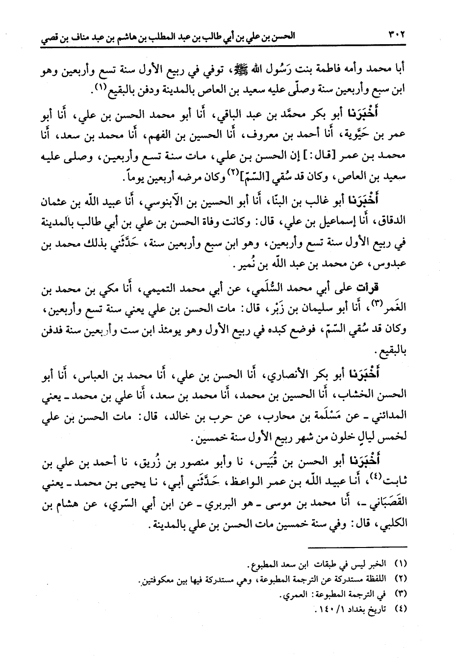 اخبرنا أبو بكر محمد بن عبد الباقي أنا أبو محمد الحسن بن علي أنا أبو عمر بن حيوية أنا احمد بن معروف أنا الحسين بن الفهم أنا محمد بن سعد أنا محمد بن عمر قال أن الحسن بن علي مات سنة تسع واربعين وصلى عليه سعيد بن العاص وكان قد سقي السم (2) وكان مرضه أربعين يوما اخبرنا أبو غالب بن البنا أنا أبو الحسين بن الابنوسي أنا عبيد الله بن عثمان الدقاق أنا إسماعيل بن علي قال وكانت وفاة الحسن بن علي بن أبي طالب بالمدينة في ربيع الأول سنة تسع وأربعين وهو ابن سبع واربعين سنة حدثني بذلك محمد بن عبدوس عن محمد بن عبد الله بن نمير قرأت على أبي محمد السلمي عن أبي محمد التميمي أنا مكي بن محمد بن الغمر (3) أنا أبو سليمان بن زبر قال مات الحسن بن علي يعني سنة تسع واربعين وكان قد سقي السم فوضع كبده في ربيع الأول وهو يومئذ ابن ست واربعين سنة فدفن بالبقيع اخبرنا أبو بكر الأنصاري أنا الحسن بن علي أنا محمد بن العباس أنا أبو الحسن الخشاب أنا الحسين بن محمد أنا محمد بن سعد أنا علي بن محمد يعني المدائني عن مسلمة بن محارب عن حرب بن خالد قال مات الحسن بن علي لخمس ليال خلون من شهر ربيع الأول سنة خمسين اخبرنا أبو الحسن بن قبيس نا وأبو منصور بن زريق نا احمد بن علي بن ثابت (4) أنا عبيد الله بن عمر الواعظ حدثني أبي نا يحيى بن محمد يعني القصباني أنا محمد بن موسى هو البربري عن ابن أبي السري عن هشام بن الكلبي قال وفي سنة خمسين مات الحسن بن علي بالمدينة