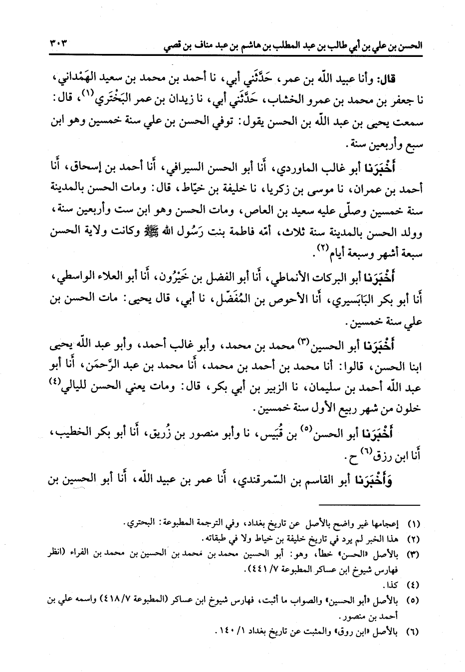 اخبرنا أبو البركات الانماطي أنا أبو الفضل بن خيرون أنا أبو العلاء الواسطي أنا أبو بكر البابسيري أنا الاحوص بن المفضل نا أبي قال يحيى مات الحسن بن علي سنة خمسين اخبرنا أبو الحسين (3) محمد بن محمد وأبو غالب احمد وأبو عبد الله يحيى ابنا الحسن قالوا أنا محمد بن احمد بن محمد أنا محمد بن عبد الرحمن أنا أبو عبد الله احمد بن سليمان نا الزبير بن أبي بكر قال ومات يعني الحسن لليالي (4) خلون من شهر ربيع الأول سنة خمسين اخبرنا أبو الحسن (5) بن قبيس نا وأبو منصور بن زريق أنا أبو بكر الخطيب أنا ابن رزق (6) ح واخبرنا أبو القاسم بن السمرقندي أنا عمر بن عبيد الله أنا أبو الحسين بن
