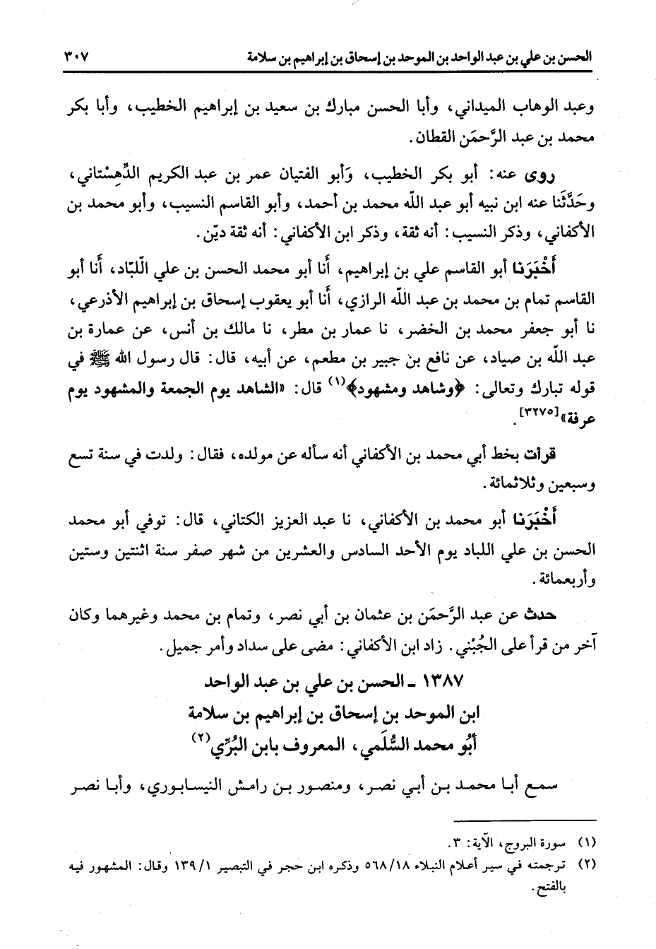 وعبد الوهاب الميداني وأبا الحسن مبارك بن سعيد بن إبراهيم الخطيب وأبا بكر محمد بن عبد الرحمن القطان روى عنه أبو بكر الخطيب وأبو الفتيان عمر بن عبد الكريم الدهستاني وحدثنا عنه ابن نبيه أبو عبد الله محمد بن احمد وأبو القاسم النسيب وأبو محمد بن ألا كفاني انه وذكر النسيب ثقة وذكر ابن الأكفاني أنه ثقة دين اخبرنا أبو القاسم علي بن إبراهيم أنا أبو محمد الحسن بن علي اللباد أنا أبو القاسم تمام بن محمد بن عبد الله الرازي أنا أبو يعقوب إسحاق بن إبراهيم الاذرعي نا أبو جعفر محمد بن الخضر نا عمار بن مطر نا مالك بن أنس عن عمارة بن عبد الله بن صياد عن نافع بن جبير نب مطعم عن أبيه قال قال رسول الله (صلى الله عليه وسلم) في قوله تبارك وتعالى " وشاهد ومشهود " (1) قال الشاهد يوم الجمعة والمشهود يوم عرفة قرأت بخط أبي محمد بن ألا كفاني انه سأله عن مولده فقال ولدت في سنة تسع وسبعين وثلاثمائة اخبرنا أبو محمد بن ألا كفاني نا عبد العزيز الكتاني قال توفي أبو محمد الحسن بن علي اللباد يوم الاحد السادس والعشرين من شهر صفر سنة اثنتين وستين واربعمائة حدث عن عبد الرحمن بن عثمان بن أبي نصر وتمام بن محمد وغيرهما وكان آخر من قرأ على الجبني زاد ابن الأكفاني مضى على سداد وامر جميل 1387 - الحسن بن علي بن عبد الواحد ابن الموحد بن إسحاق بن إبراهيم بن سلامة أبو محمد السلمي المعروف بابن البري (2) سمع أبا محمد بن أبي نصرة ومنصور بن رامش النيسابوري وابا نصر