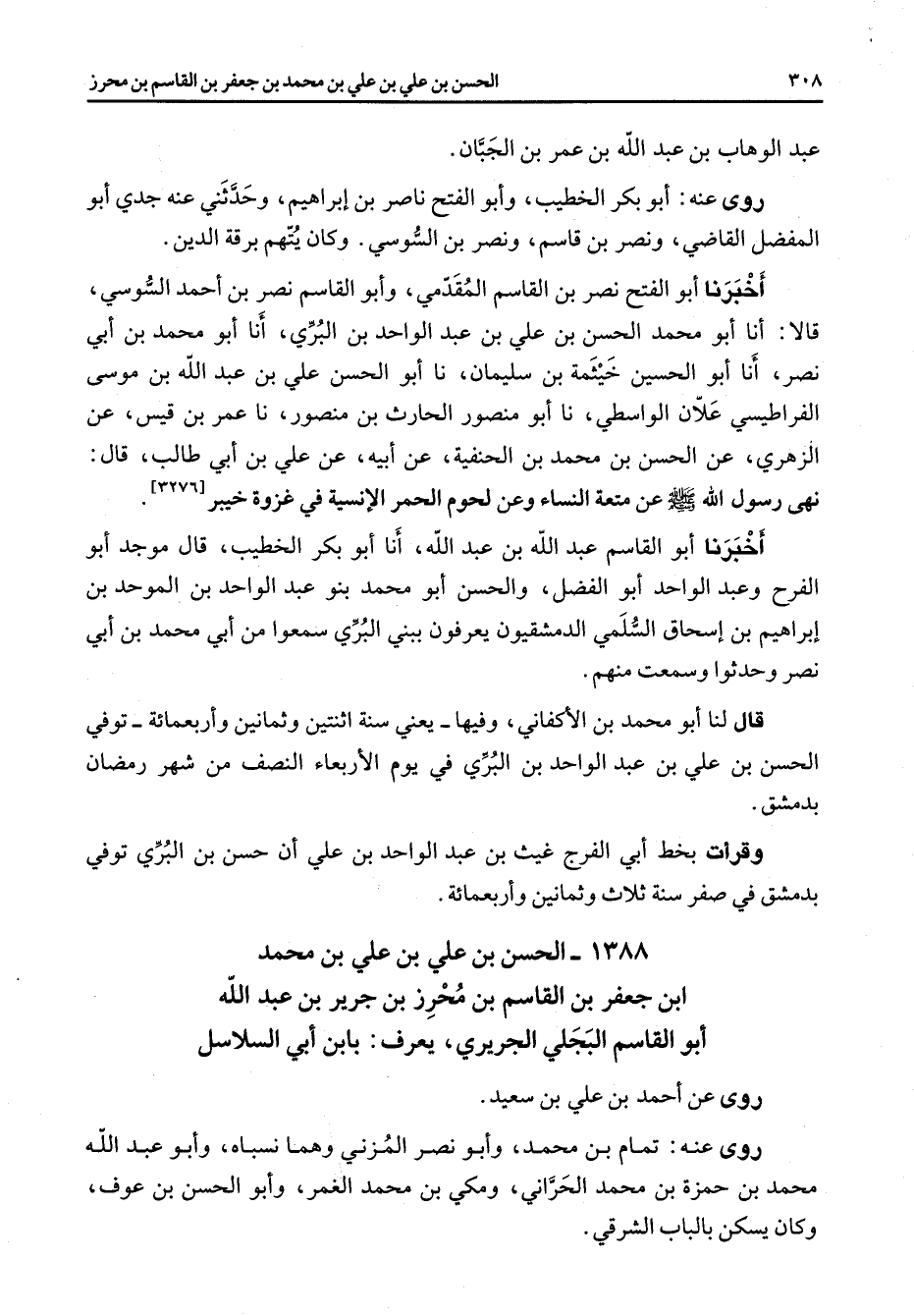 1388 - الحسن بن علي بن علي بن محمد ابن جعفر بن القاسم بن محرز بن جرير بن عبد الله أبو القاسم البجلي الجريري يعرف بابن أبي السلاسل روى عن احمد بن علي بن سعيد روى عنه تمام بن محمد وأبو نصر المزني وهما نسباه وأبو عبد الله محمد بن حمزة بن محمد الحراني ومكي بن محمد الغمر وأبو الحسن بن عوف وكان يسكن بالباب الشرقي