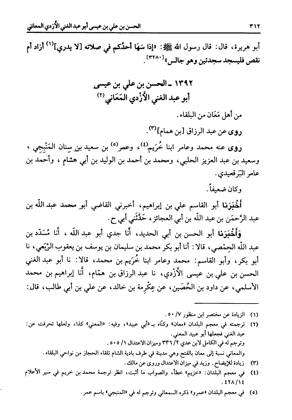 أبو هريرة قال قال رسول الله (صلى الله عليه وسلم) إذا سها احدكم في صلاته لا يدري (1) ازاد أم نقص فليسجد سجدتين وهو جالس 1392 - الحسن بن علي بن عيسى أبو عبد الغني الازدي المعاني (2) من أهل معان من البلقاء روى عن عبد الرزاق بن همام (3)