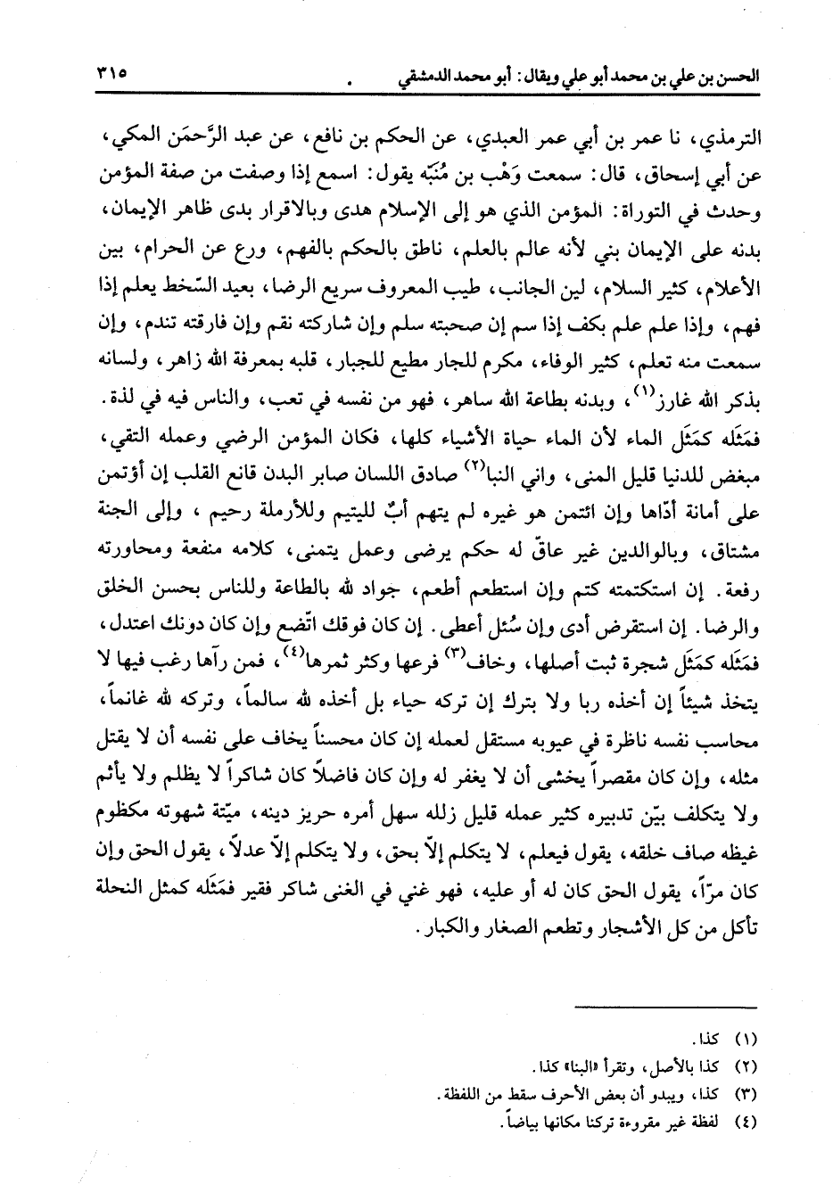 الترمذي نا عمر بن أبي عمر العبدي عن الحكم بن نافع عن عبد الرحمن المكي عن أبي إسحاق قال سمعت وهب بن منبة يقول اسمع إذا وصفت من صفة المؤمن وحدث في التوراة المؤمن الذي هو إلى الإسلام هدى وبالاقرار بدى ظاهر الإيمان بدنه على الإيمان بني لانه عالم بالعلم ناطق بالحكم بالفهم ورع عن الحرام بين الأعلام كثير السلام لين الجانب طيب المعروف سريع الرضا بعيد السخط يعلم إذا فهم وإذا علم علم بكف إذا سم أن صحبته سلم وان شاركته نقم وان فارقته تندم وان سمعت منه تعلم كثير الوفاء مكرم للجار مطيع للجبار قلبه بمعرفة الله زاهر ولسانه بذكر الله غارز (1) وبدنه بطاعة الله ساهر فهو من نفسه في تعب والناس فيه في لذة فمثله كمثل الماء لان الماء حياة الاشياء كلها فكان المؤمن الرضي وعمله التقي مبغض للدنيا قليل المنى واني النبا (2) صادق اللسان صابر البدن قانع القلب أن اؤتمن على امانة أداها وان ائتمن هو غيره لم يتهم اب لليتيم وللأرملة رحيم والى الجنة مشتاق وبالوالدين غير عاق له حكم يرضى وعمل يتمنى كلامه منفعة ومحاورته رفعة أن استكتمته كتم وان استطعم أطعم جواد لله بالطاعة وللناس بحسن الخلق والرضا أن استقرض أدى وان سئل أعطى أن كان فوقك اتضع وان كان دونك اعتدل فمثله كمثل شجرة ثبت اصلها وخاف (3) فرعها وكثر ثمرها (4) فمن رآها رغب فيها لا يتخذ شيئا أن اخذه ربا ولا بترك أن تركه حياء بل اخذه لله سالما وتركه لله غانما محاسب نفسه ناظرة في عيوبه مستقل لعمله أن كان محسنا يخاف على نفسه أن لا يقتل مثله وان كان مقصرا يخشى أن يغفر له وان كان فاضلا كان شاكرا لا يظلم ولا يأثم ولا يتكلف بين تدبيره كثير عمله قليل زلله سهل آمره حريز دينه ميتة شهوته مكظوم غيظه صاف خلقة يقول فيعلم لا يتكلم إلا بحق ولا يتكلم إلا عدلا يقول الحق وان كان مرا يقول الحق كان له أو عليه فهو غني في الغنى شاكر فقير فمثله كمثل النحلة تأكل من كل الاشجار وتطعم الصغار والكبار
