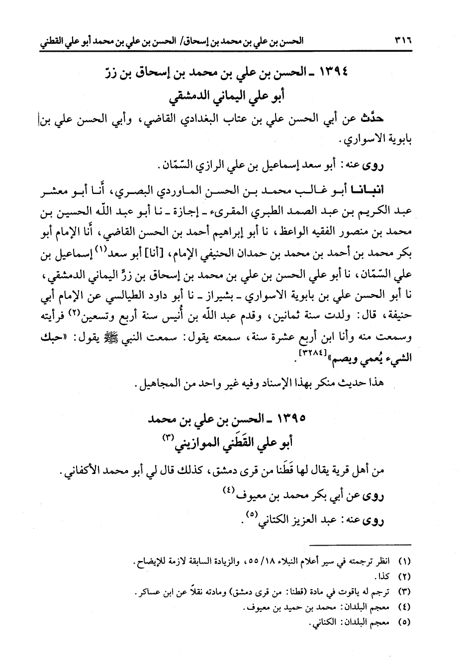 1395 - الحسن بن علي بن محمد أبو علي القطني الموازيني (3) من أهل قرية يقال لها قطنا من قرى دمشق كذلك قال لي أبو محمد ألا كفاني روى عن أبي بكر محمد بن معيوف (4) روى عنه عبد العزيز الكتاني (5)