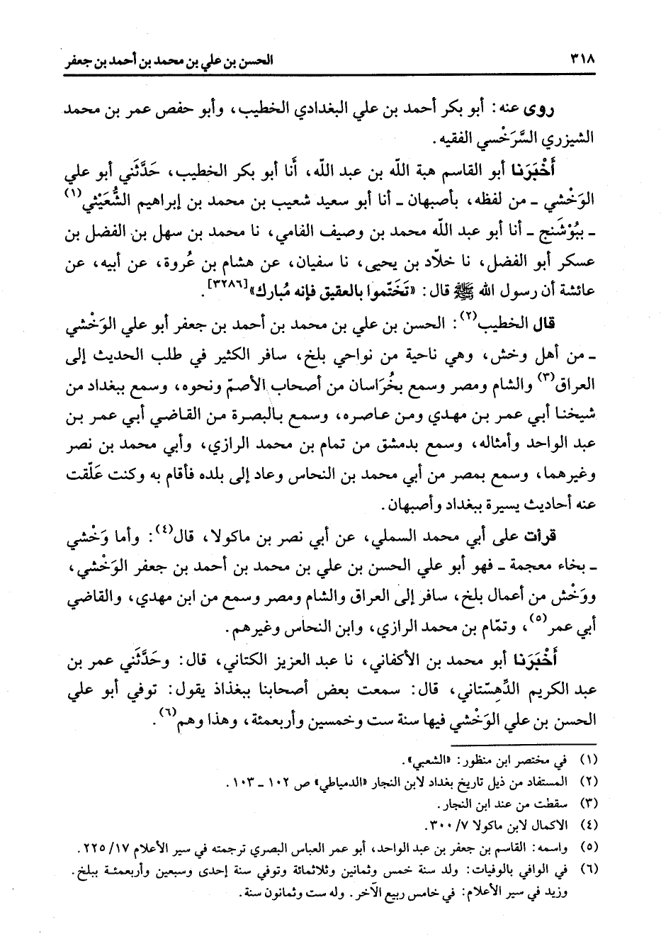 روى عنه أبو بكر احمد بن علي البغدادي الخطيب وأبو حفص عمر بن محمد الشيزري السرخسي الفقيه اخبرنا أبو القاسم هبة الله بن عبد الله أنا أبو بكر الخطيب حدثني أبو علي الوخشي من لفظه بأصبهان أنا أبو سعيد شعيب بن محمد بن إبراهيم الشعيثي (1) ببوشنج أنا أبو عبد الله محمد بن وصيف الفامي نا محمد بن سهل بن الفضل بن عسكر أبو الفضل نا خلاد بن يحيى نا سفيان عن هشام بن عروة عن أبيه عن عائشة أن رسول الله (صلى الله عليه وسلم) قال تختموا بالعقيق فإنه مبارك قال الخطيب (2) : الحسن بن علي بن محمد بن احمد بن جعفر أبو علي الوخشي من أهل وخش وهي ناحية من نواحي بلخ سافر الكثير في طلب الحديث إلى العراق (3) والشام ومصر وسمع بخراسان من أصحاب الاصم ونحوه وسمع ببغداد من شيخنا أبي عمر بن مهدي ومن عاصره وسمع بالبصرة من القاضي أبي عمر بن عبد الواحد وامثاله وسمع بدمشق من تمام بن محمد الرازي وأبي محمد بن نصر وغيرهما وسمع بمصر من أبي محمد بن النحاس وعاد إلى بلده فأقام به وكنت علقت عنه أحاديث يسيرة ببغداد واصبهان قرأت على أبي محمد السلمي عن أبي نصر بن ماكولا قال (4) واما وخشي بخاء معجمة فهو أبو علي الحسن بن علي بن محمد بن احمد بن جعفر الوخشي ووخش من أعمال بلخ سافر إلى العراق والشام ومصر وسمع من ابن مهدي والقاضي أبي عمر (5) وتمام بن محمد الرازي وابن النحاس وغيرهم اخبرنا أبو محمد بن ألا كفاني نا عبد العزيز الكتاني قال وحدثني عمر بن عبد الكريم الدهستاني قال سمعت بعض اصحابنا ببغذاذ يقول توفي أبو علي الحسن بن علي الوخشي فيها سنة ست وخمسين واربعمئة وهذا وهم (6)