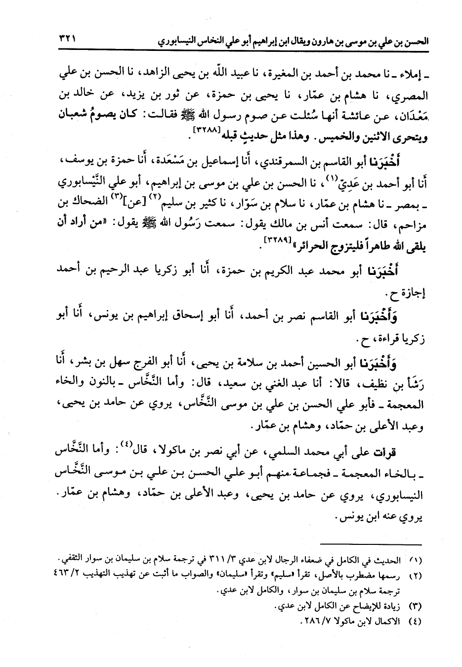 إملاء نا محمد بن احمد بن المغيرة نا عبيد الله بن يحيى الزاهد نا الحسن بن علي المصري نا هشام بن عمار نا يحيى بن حمزة عن ثور بن يزيد عن خالد بن معدان عن عائشة إنها سئلت عن صوم رسول الله (صلى الله عليه وسلم) فقالت كان يصوم شعبان ويتحرى الاثنين والخميس وهذا مثل حديث قبله اخبرنا أبو القاسم بن السمرقندي أنا إسماعيل بن مسعدة أنا حمزة بن يوسف أنا أبو احمد بن عدي (1) نا الحسن بن علي بن موسى بن إبراهيم أبو علي النيسابوري بمصر نا هشام بن عمار نا سلام بن سوار نا كثير بن سليم (2) عن (3) الضحاك بن مزاحم قال سمعت انس بن مالك يقول سمعت رسول الله (صلى الله عليه وسلم) يقول من أراد أن يلقى الله طاهرا فليتزوج الحرائر اخبرنا أبو محمد عبد الكريم بن حمزة أنا أبو زكريا عبد الرحيم بن احمد اجازة واخبرنا أبو القاسم نصر بن احمد أنا أبو إسحاق إبراهيم بن يونس أنا أبو زكريا قراءة واخبرنا أبو الحسين احمد بن سلامة بن يحيى أنا أبو الفرج سهل بن بشر أنا رشأ بن نظيف قالا أنا عبد الغني بن سعيد قال واما النخاس بالنون والخاء المعجمة فأبو علي الحسن بن علي بن موسى النخاس يروي عن حامد بن يحيى وعبد الاعلى بن حماد وهشام بن عمار قرأت على أبي محمد السلمي عن أبي نصر بن ماكولا قال (4) : واما النخاس بالخاء المعجمة فجماعة منهم أبو علي الحسن بن علي بن موسى النخاس النيسابوري يروي عن حامد بن يحيى وعبد الاعلى بن حماد وهشام بن عمار يروي عنه ابن يونس