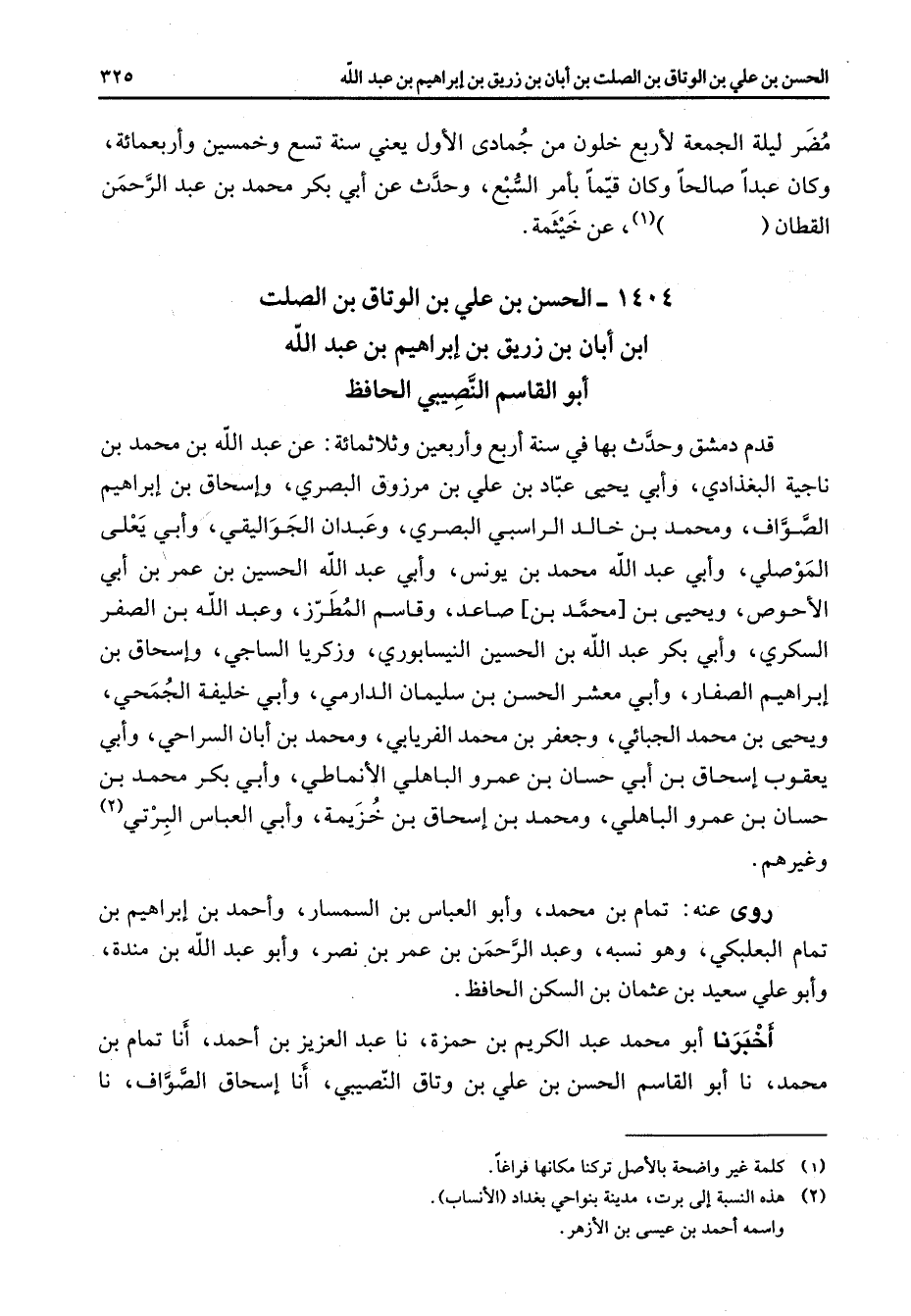 1404 - الحسن بن علي بن الوتاق بن الصلت ابن ابان بن زريق بن إبراهيم بن عبد الله أبو القاسم النصيبي الحافظ قدم دمشق وحدث بها في سنة أربع واربعين وثلاثمائة عن عبد الله بن محمد بن ناجية البغذادي وأبي يحيى عباد بن علي بن مرزوق البصري واسحاق بن إبراهيم الصواف ومحمد بن خالد الراسبي البصري وعبدان الجواليقي وأبي يعلي الموصلي وأبي عبد الله محمد بن يونس وأبي عبد الله الحسين بن عمر بن أبي الاحوص ويحيى بن محمد بن صاعد وقاسم المطرز وعبد الله بن الصفر السكري وأبي بكر عبد الله بن الحسين النيسابوري وزكريا الساجي واسحاق بن إبراهيم الصفار وأبي معشر الحسن بن سليمان الدارمي وأبي خليفة الجمحي ويحيى بن محمد الجبائي وجعفر بن محمد الفريابي ومحمد بن ابان السراحي وأبي يعقوب إسحاق بن أبي حسان بن عمرو الباهلي الانماطي وأبي بكر محمد بن حسان بن عمرو الباهلي ومحمد بن إسحاق بن خزيمة وأبي العباس البرتي (2) وغيرهم روى عنه تمام بن محمد وأبو العباس بن السمسار واحمد بن إبراهيم بن تمام البعلبكي وهو نسبه وعبد الرحمن بن عمر بن نصر وأبو عبد الله بن مندة وأبو علي سعيد بن عثمان بن السكن الحافظ اخبرنا أبو محمد عبد الكريم بن حمزة نا عبد العزيز بن احمد أنا تمام بن محمد نا أبو القاسم الحسن بن علي بن وتاق النصيبي أنا إسحاق الصواف نا