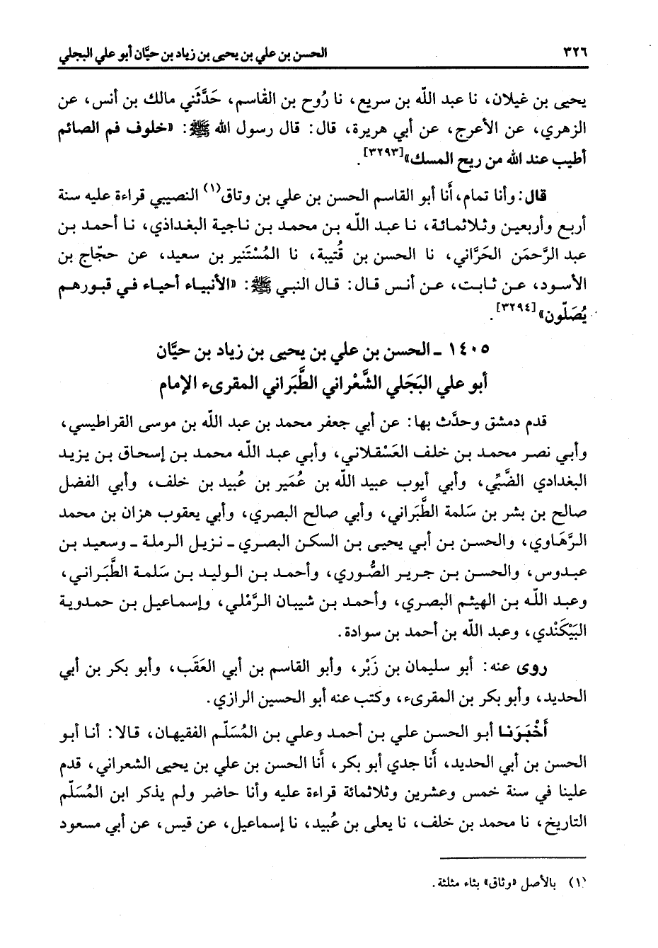 يحيى بن غيلان نا عبد الله بن سريع نا روح بن القاسم حدثني مالك بن انس عن الزهري عن الاعرج عن أبي هريرة قال قال رسول الله (صلى الله عليه وسلم) خلوف فم الصائم اطيب عند الله من ريح المسك قال وأنا تمام أنا أبو القاسم الحسن بن علي بن وتاق (1) النصيبي قراءة عليه سنة أربع واربعين وثلاثمائة نا عبد الله بن محمد بن ناجية البغداذي نا احمد بن عبد الرحمن الحراني نا الحسن بن قتيبة نا المستنير بن سعيد عن حجاج بن الأسود عن ثابت عن انس قال قال النبي (صلى الله عليه وسلم) الأنبياء أحياء في قبورهم يصلون