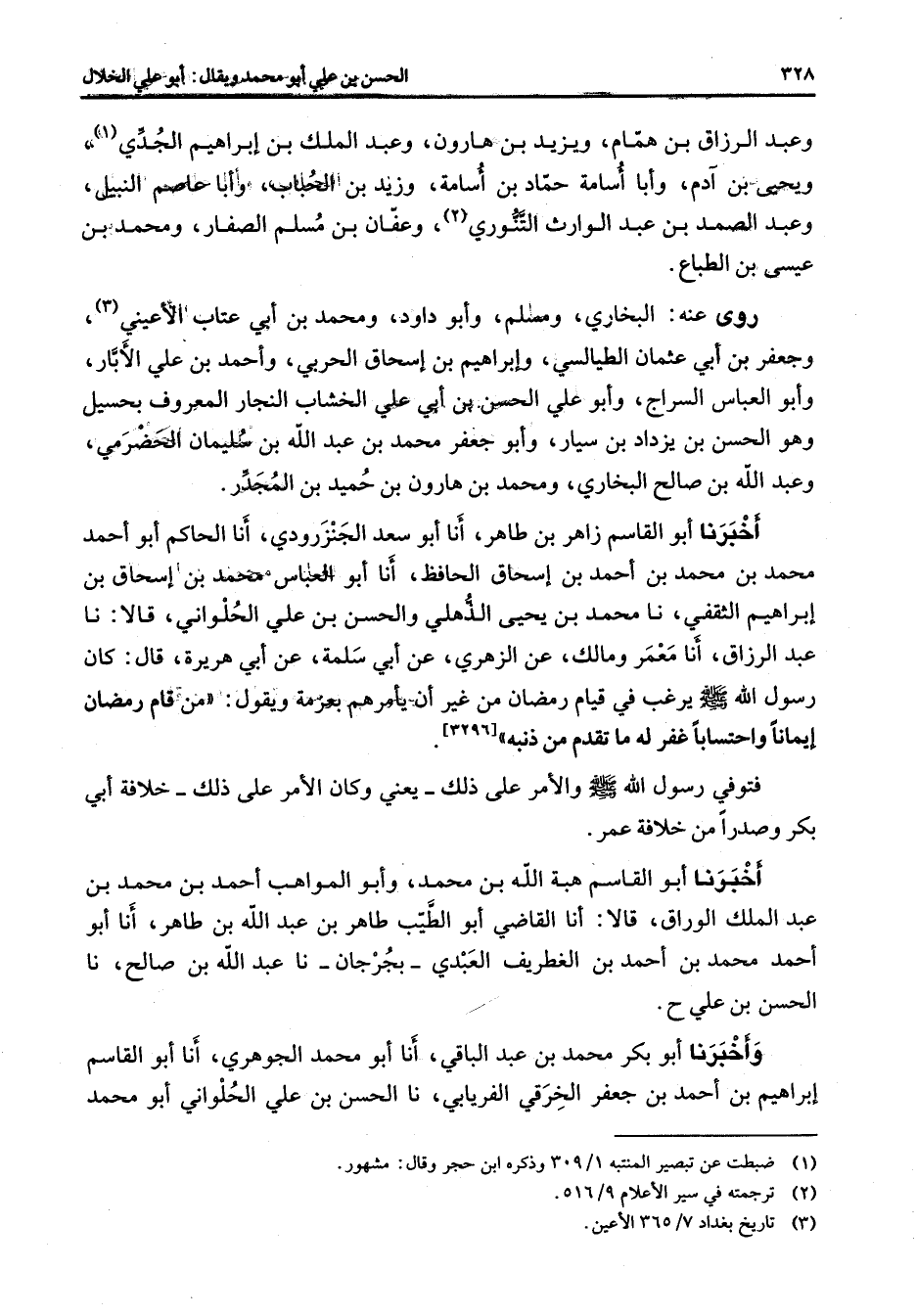 وعبد الرزاق بن همام ويزيد بن هارون وعبد الملك بن إبراهيم الجدي (1) ويحيى بن آدم وأبا اسامة حماد بن اسامة وزيد بن الحباب وأبا عاصم النبيل وعبد الصمد بن عبد الوارث التنوري (2) وعفان بن مسلم الصفار ومحمد بن عيسى بن الطباع روى عنه البخاري ومسلم وأبو داود ومحمد بن أبي عتاب الاعيني (3) وجعفر بن أبي عثمان الطيالسي وابراهيم بن إسحاق الحربي واحمد بن علي الابار وأبو العباس السراج وأبو علي الحسن بن أبي علي الخشاب النجار المعروف بحسيل وهو الحسن بن يزداد بن سيار وأبو جعفر محمد بن عبد الله بن سليمان الحضرمي وعبد الله بن صالح البخاري ومحمد بن هارون بن حميد بن المجدر اخبرنا أبو القاسم زاهر بن طاهر أنا أبو سعد الجنزرودي أنا الحاكم أبو احمد محمد بن محمد بن احمد بن إسحاق الحافظ أنا أبو العباس محمد بن إسحاق بن إبراهيم الثقفي نا محمد بن يحيى الذهلي والحسن بن علي الحلواني قالا نا عبد الرزاق أنا معمر ومالك عن الزهري عن أبي سلمة عن أبي هريرة قال كان رسول الله (صلى الله عليه وسلم) يرغب في قيام رمضان من غير أن يأمرهم بعزمة ويقول من قام رمضان ايمانا واحتسابا غفر له ما تقدم من ذنبه فتوفي رسول الله (صلى الله عليه وسلم) والأمر على ذلك يعني وكان الأمر على ذلك خلافة أبي بكر وصدرا من خلافة عمر أخبرنا أبو القاسم هبة الله بن محمد وأبو المواهب احمد بن محمد بن عبد الملك الوراق قالا أنا القاضي أبو الطيب طاهر بن عبد الله بن طاهر أنا أبو احمد محمد بن احمد بن الغطريف العبدي بجرجان نا عبد الله بن صالح نا الحسن بن علي وأخبرنا أبو بكر محمد بن عبد الباقي أنا أبو محمد الجوهري أنا أبو القاسم إبراهيم بن احمد بن جعفر الخرقي الفريابي نا الحسن بن علي الحلواني أبو محمد