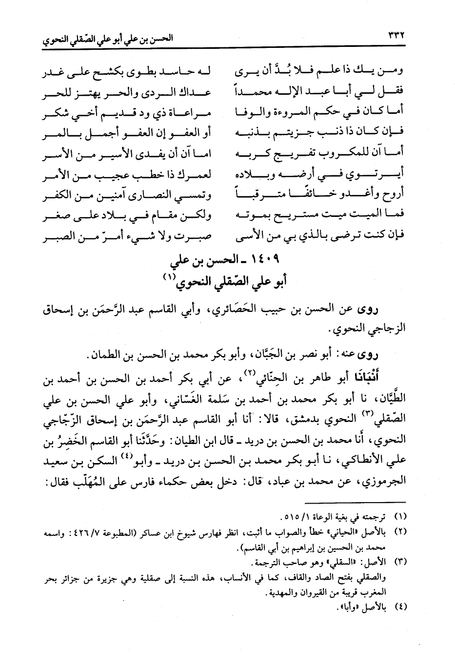 1409 - الحسن بن علي أبو علي الصقلي النحوي (1) روى عن الحسن بن حبيب الحصائري وأبي القاسم عبد الرحمن بن إسحاق الزجاجي النحوي روى عنه أبو نصر بن الجبان وأبو بكر محمد بن الحسن بن الطمان أنبأنا أبو طاهر بن الحنائي (2) عن أبي بكر احمد بن الحسن بن احمد بن الطيان نا أبو بكر محمد بن احمد بن سلمة الغساني وأبو علي الحسن بن علي الصقلي (3) النحوي بدمشق قالا أنا أبو القاسم عبد الرحمن بن إسحاق الزجاجي النحوي أنا محمد بن الحسن بن دريد قال ابن الطيان وحدثنا أبو القاسم الخضر بن علي الانطاكي نا أبو بكر محمد بن الحسن بن دريد وأبو (4) السكن بن سعيد الجرموزي عن محمد بن عباد قال دخل بعض حكماء فارس على المهلب فقال