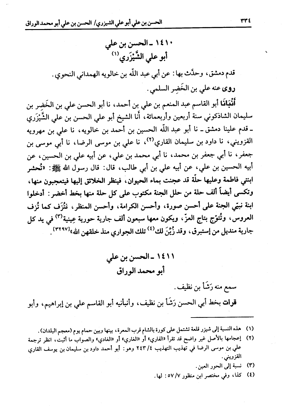 1411 - الحسن بن علي أبو محمد الوراق سمع منه رشأ بن نظيف قرأت بخط أبي الحسن رشأ بن نظيف وأنبأنيه أبو القاسم علي بن إبراهيم وأبو