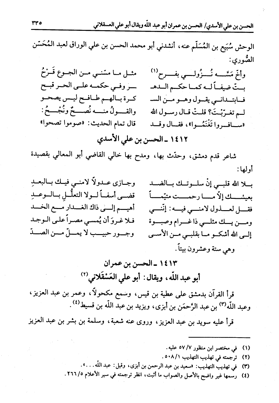 1413 - الحسن بن عمران أبو عبد الله ويقال أبو علي العسقلاني (2) قرأ القرآن بدمشق على عطية بن قيس وسمح مكحولا وعمر بن عبد العزيز وعبد الله (3) بن عبد الرحمن بن ابزى ويزيد بن عبد الله بن قسيط (4)