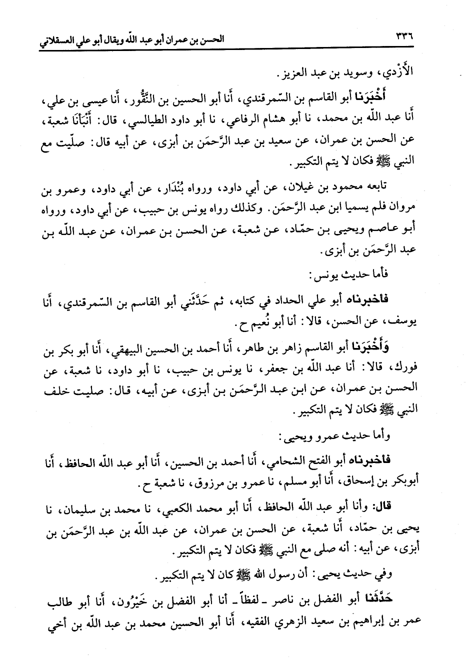 الازدي وسويد بن عبد العزيز اخبرنا أبو القاسم بن السمرقندي أنا أبو الحسين بن النقور أنا عيسى بن علي أنا عبد الله بن محمد نا أبو هشام الرفاعي نا أبو داود الطيالسي قال أنبأنا شعبة عن الحسن بن عمران عن سعيد بن عبد الرحمن بن ابزى عن أبيه قال صليت مع النبي (صلى الله عليه وسلم) فكان لا يتم التكبير تابعة محمود بن غيلان عن أبي داود ورواه بندار عن أبي داود وعمرو بن مروان فلم يسميا ابن عبد الرحمن وكذلك رواه يونس بن حبيب عن أبي داود ورواه أبو عاصم ويحيى بن حماد عن شعبة عن الحسن بن عمران عن عبد الله بن عبد الرحمن بن ابزى فأما حديث يونس فاخبرناه أبو علي الحداد في كتابه ثم حدثني أبو القاسم بن السمرقندي أنا يوسف عن الحسن قالا أنا أبو نعيم واخبرنا أبو القاسم زاهر بن طاهر أنا احمد بن الحسين البيهقي أنا أبو بكر بن فورك قالا أنا عبد الله بن جعفر نا يونس بن حبيب نا أبو دواد نا شعبة عن الحسن بن عمران عن ابن عبد الرحمن بن ابزى عن أبيه قال صليت خلف النبي (صلى الله عليه وسلم) فكان لا يتم التكبير واما حديث عمرو ويحيى فاخبرناه أبو الفتح الشحامي أنا احمد بن الحسين أنا أبو عبد الله الحافظ أنا أبو بكر بن إسحاق أنا أبو مسلم نا عمرو بن مرزوق نا شعبة قال وأنا أبو عبد الله الحافظ أنا أبو محمد الكعبي نا محمد بن سليمان نا يحيى بن حماد انا شعبة عن الحسن بن عمران عن عبد الله بن عبد الرحمن بن ابزى عن أبيه انه صلى مع النبي (صلى الله عليه وسلم) فكان لا يتم التكبير وفي حديث يحيى أن رسول الله (صلى الله عليه وسلم) كان لا يتم التكبير حدثنا أبو الفضل بن ناصر لفظا أنا أبو الفضل بن خيرون أنا أبو طالب عمر بن إبراهيم بن سعيد الزهري الفقيه أنا أبو الحسين محمد بن عبد الله بن اخي