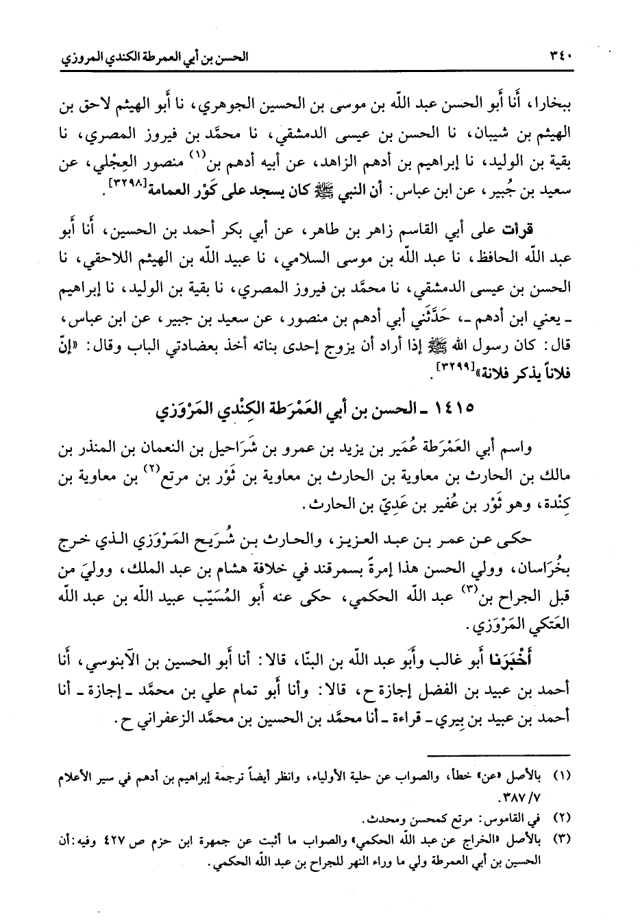 1415 - الحسن بن أبي العمرطة الكندي المروزي واسم أبي العمرطة عمير بن يزيد بن عمرو بن شراحيل بن النعمان بن المنذر بن مالك بن الحارث بن معاوية بن الحارث بن معاوية بن ثور بن مرتع (2) بن معاوية بن كندة وهو ثور بن عفير بن عدي بن الحارث حكى عن عمر بن عبد العزيز والحارث بن شريح المروزي الذي خرج بخراسان وولي الحسن هذا امرة بسمرقند في خلافة هشام بن عبد الملك وولي من قبل الجراح (3) بن عبد الله الحكمي حكى عنه أبو المسيب عبيد الله بن عبد الله العتكي المروزي اخبرنا أبو غالب وأبو عبد الله بن البنا قالا أنا أبو الحسين بن الابنوسي أنا احمد بن عبيد بن الفضل اجازة قالا وأنا أبو تمام علي بن محمد اجازة أنا احمد بن عبيد بن بيري قراءة أنا محمد بن الحسين بن محمد الزعفراني