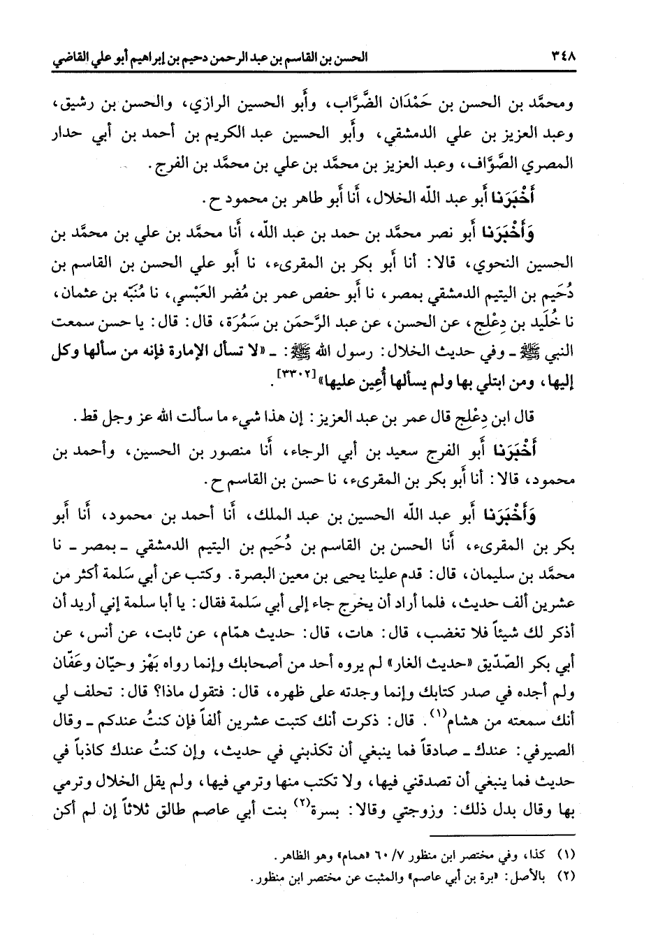 ومحمد بن الحسن بن حمدان الضراب وأبو الحسين الرازي والحسن بن رشيق وعبد العزيز بن علي الدمشقي وأبو الحسين عبد الكريم بن احمد بن أبي حدار المصري الصواف وعبد العزيز بن محمد بن علي بن محمد بن الفرج أخبرنا أبو عبد الله الخلال أنا أبو طاهر بن محمود واخبرنا أبو نصر محمد بن حمد بن عبد الله أنا محمد بن علي بن محمد بن الحسين النحوي قالا أنا أبو بكر بن المقرئ نا أبو علي الحسن بن القاسم بن دحيم بن اليتيم الدمشقي بمصر نا أبو حفص عمر بن مضر العبسي نا منبة بن عثمان نا خليد بن دعلج عن الحسن عن عبد الرحمن بن سمرة قال قال يا حسن سمعت النبي (صلى الله عليه وسلم) وفي حديث الخلال رسول الله (صلى الله عليه وسلم) لا تسأل الامارة فإنه من سألها وكل إليها ومن ابتلي بها ولم يسألها اعين عليها قال ابن دعلج قال عمر بن عبد العزيز أن هذا شئ ما سألت الله عز وجل قط اخبرنا أبو الفرج سعيد بن أبي الرجاء أنا منصور بن الحسين واحمد بن محمود قالا أنا أبو بكر بن المقرئ نا حسن بن القاسم واخبرنا أبو عبد الله الحسين بن عبد الملك أنا احمد بن محمود أنا أبو بكر بن المقرئ أنا الحسن بن القاسم دحيم بن اليتيم الدمشقي بمصر نا محمد بن سليمان قال قدم علينا يحيى بن معين البصرة وكتب عن أبي سلمة اكثر من عشرين ألف حديث فلما أراد أن يخرج جاء إلى أبي سلمة فقال يا أبا سلمة أني أريد أن اذكر لك شيئا فلا تغضب قال هات قال حديث همام عن ثابت عن انس عن أبي بكر الصديق حديث الغار لم يروه أحد من أصحابك وانما رواه بهز وحيان وعفان ولم اجده في صدر كتابك وانما وجدته على ظهره قال فتقول ماذا قال تحلف لي انك سمعته من هشام (1)