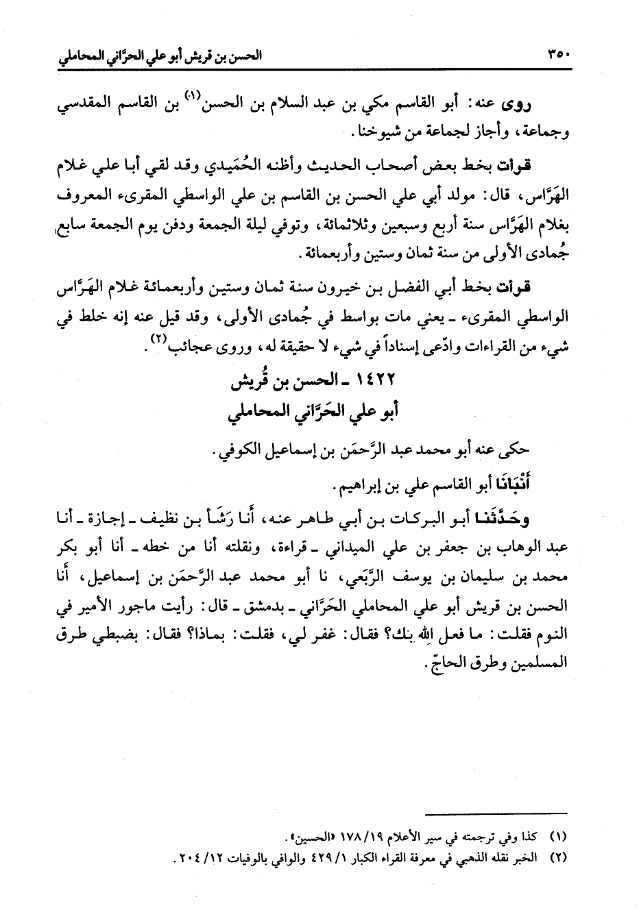 1422 - الحسن بن قريش أبو علي الحراني المحاملي حكى عنه أبو محمد عبد الرحمن بن إسماعيل الكوفي أنبأنا أبو القاسم علي بن إبراهيم وحدثنا أبو البركات بن أبي طاهر عنه أنا رشأ بن نظيف اجازة أنا عبد الوهاب بن جعفر بن علي الميداني قراءة ونقلته أنا من خطه أنا أبو بكر محمد بن سليمان بن يوسف الربعي نا أبو محمد عبد الرحمن بن إسماعيل أنا الحسن بن قريش أبو علي المحاملي الحراني بدمشق قال رأيت مأجور الأمير في النوم فقلت ما فعل الله بك فقال غفر لي فقلت بماذا فقال بضبطي طرق المسلمين طرق الحاج