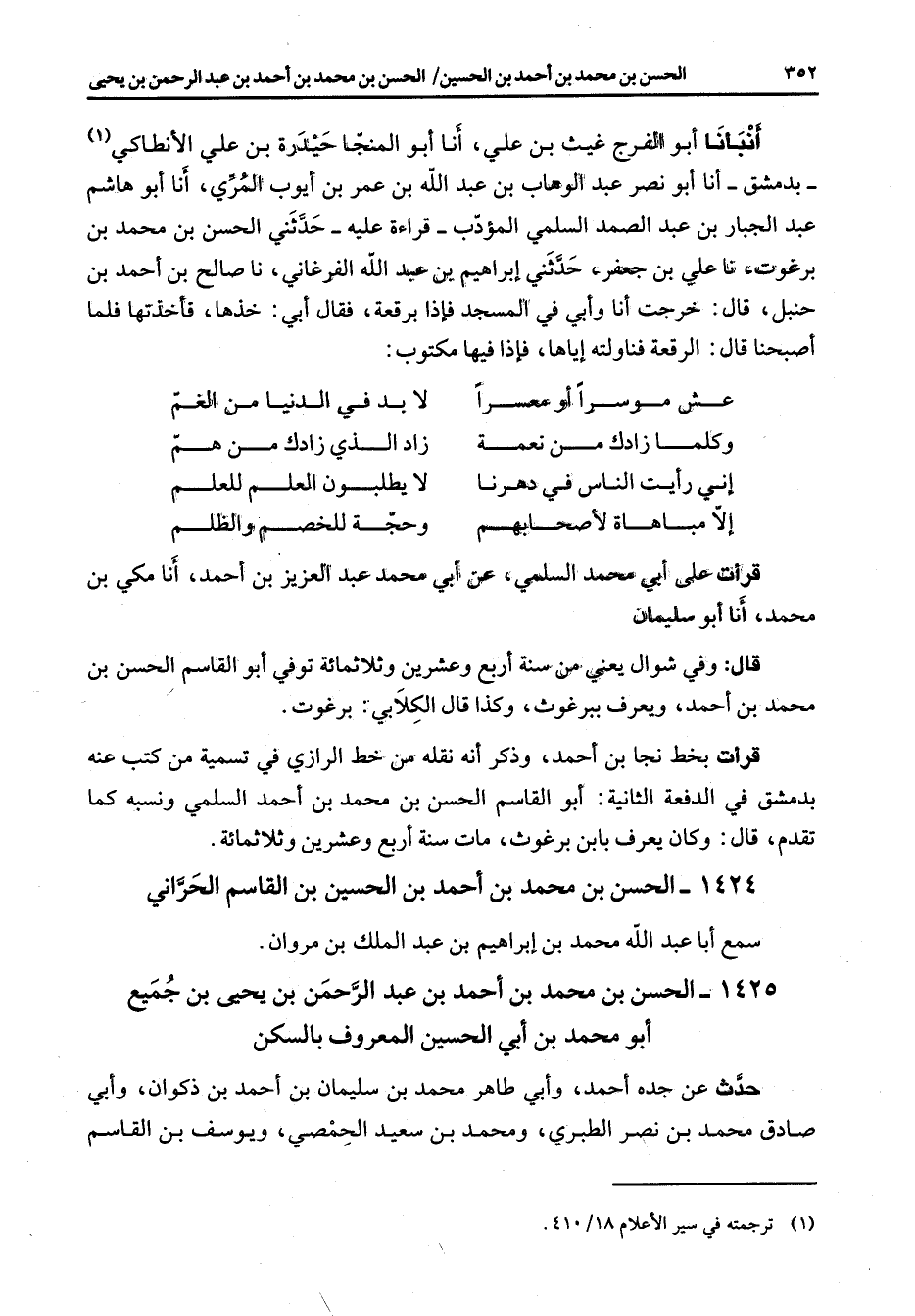 أنبأنا أبو الفرج غيث بن علي أنا أبو المنجا حيدرة بن علي الانطاكي (1) بدمشق أنا أبو نصر عبد الوهاب بن عبد الله بن عمر بن آيوب المري أنا أبو هاشم عبد الجبار بن عبد الصمد السلمي المؤدب قراءة عليه حدثني الحسن بن محمد بن برغوت نا علي بن جعفر حدثني إبراهيم بن عبد الله الفرغاني نا صالح بن احمد بن حنبل قال خرجت أنا وأبي في المسجد فإذا برقعة فقال أبي خذها فأخذتها فلما اصبحنا قال الرقعة فناولته إياها فإذا فيها مكتوب: * عش موسرا أو معسرا * لا بد في الدنيا من الغم وكلما زادك من نعمة * زاد الذي زادك من هم أني رأيت الناس في دهرنا * لا يطلبون العلم للعلم إلا مباهاة لاصحابهم * وحجة للخصم والظلم * قرأت على أبي محمد السلمي عن أبي محمد عبد العزيز بن احمد أنا مكي بن محمد أنا أبو سليمان قال وفي شوال يعني من سنة أربع وعشرين وثلاثمائة توفي أبو القاسم الحسن بن محمد بن احمد ويعرف ببرغوث وكذا قال الكلابي برغوت قرأت بخط نجا بن احمد وذكر انه نقله من خط الرازي في تسمية من كتب عنه بدمشق في الدفعة الثانية أبو القاسم الحسن بن محمد بن احمد السلمي ونسبه كما تقدم قال وكان يعرف بابن برغوث مات سنة أربع وعشرين وثلاثمائة