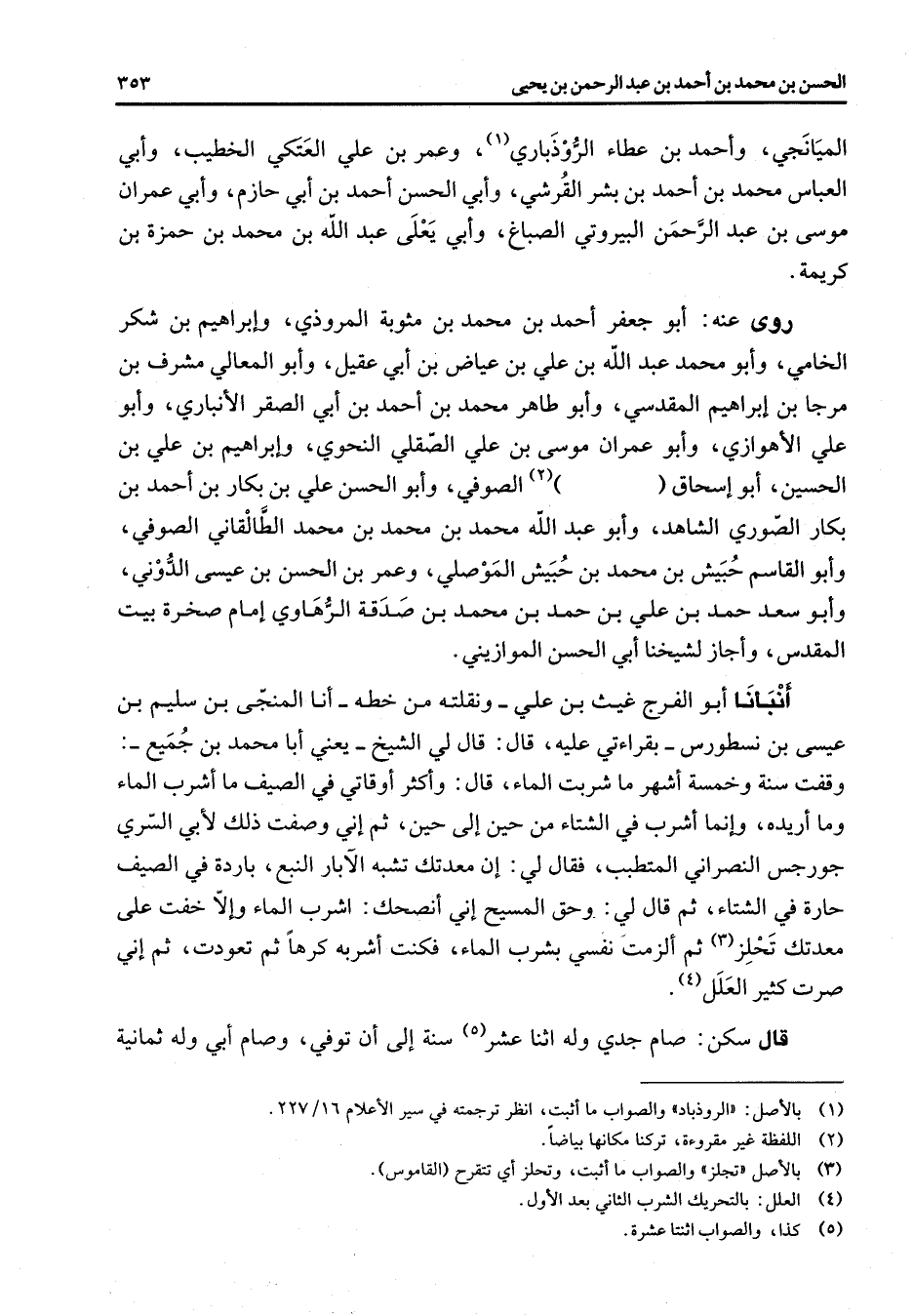 الميانجي واحمد بن عطاء الروذباري (1) وعمر بن علي العتكي الخطيب وأبي العباس محمد بن احمد بن بشر القرشي وأبي الحسن احمد بن أبي حازم وأبي عمران موسى بن عبد الرحمن البيروتي الصباغ وأبي يعلي عبد الله بن محمد بن حمزة بن كريمة روى عنه أبو جعفر احمد بن محمد بن مثوبة المروذي وابراهيم بن شكر الخامي وأبو محمد عبد الله بن علي بن عياض بن أبي عقيل وأبو المعالي مشرف بن مرجا بن إبراهيم المقدسي وأبو طاهر محمد بن احمد بن أبي الصقر الانباري وأبو علي الاهوازي وأبو عمران موسى بن علي الصقلي النحوي وابراهيم بن علي بن الحسين أبو إسحاق (2) الصوفي وأبو الحسن علي بن بكار بن احمد بن بكار الصوري الشاهد وأبو عبد الله محمد بن محمد بن محمد الطالقاني الصوفي وأبو القاسم حبيش بن محمد بن حبيش الموصلي وعمر بن الحسن بن عيسى الدوني وأبو سعد حمد بن علي بن حمد بن محمد بن صدقة الرهاوي امام صخرة بيت المقدس واجاز لشيخنا أبي الحسن الموازيني أنبأنا أبو الفرج غيث بن علي ونقلته من خطه أنا المنجى بن سليم بن عيسى بن نسطورس بقراءتي عليه قال قال لي الشيخ يعني أبا محمد بن جميع وقفت سنة وخمسة اشهر ما شربت الماء قال واكثر اوقاتي في الصيف ما اشرب الماء وما اريده وانما اشرب في الشتاء من حين إلى حين ثم أني وصفت ذلك لأبي السري جورجس النصراني المتطبب فقال لي أن معدتك تشبه الابار النبع باردة في الصيف حارة في الشتاء ثم قال لي وحق المسيح أني انصحك اشرب الماء وألا خفت على معدتك تحلز (3) ثم الزمت نفسي بشرب الماء فكنت اشربه كرها ثم تعودت ثم أني صرت كثير العلل (4)