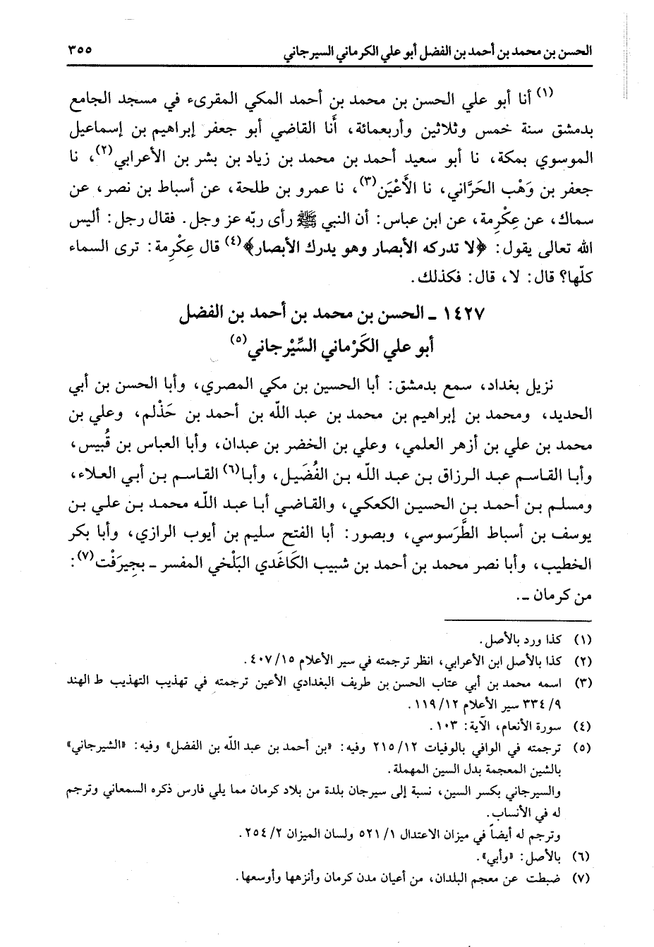 1427 - الحسن بن محمد بن احمد بن الفضل أبو علي الكرماني السيرجاني (5) نزيل بغداد سمع بدمشق أبا الحسين بن مكي المصري وأبا الحسن بن أبي الحديد ومحمد بن إبراهيم بن محمد بن عبد الله بن احمد بن حذلم وعلي بن محمد بن علي بن ازهر العلمي وعلي بن الخضر بن عبدان وأبا العباس بن قبيس وأبا القاسم عبد الرزاق بن عبد الله بن الفضيل وأبا (6) القاسم بن أبي العلاء ومسلم بن احمد بن الحسين الكعكي والقاضي أبا عبد الله محمد بن علي بن يوسف بن اسباط الطرسوسي وبصور أبا الفتح سليم بن أيوب الرازي وأبا بكر الخطيب وأبا نصر محمد بن احمد بن شبيب الكاغدي البلخي المفسر بجيرفت (7) : من كرمان