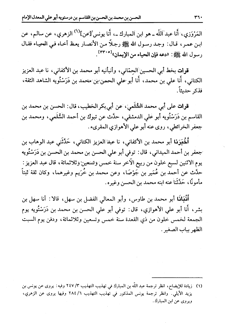المروزي أنا عبد الله هو ابن المبارك أنا يونس عن (1) الزهري عن سالم عن ابن عمر قال وجد رسول الله (صلى الله عليه وسلم) رجلا من الأنصار يعظ اخاه في الحياء فقال رسول الله (صلى الله عليه وسلم) دعه فإن الحياء من الإيمان قرأت بخط أبي الحسين الحماني وانبأنيه أبو محمد بن ألا كفاني نا عبد العزيز الكتاني أنا علي بن محمد أنا أبو علي الحسن بن محمد بن درستويه الشاهد الثقة فذكر حديثا قرأت على أبي محمد السلمي عن أبي بكر الخطيب قال الحسن بن محمد بن القاسم بن درستويه أبو علي الدمشقي حدث عن تبوك بن أحمد السلمي ومحمد بن جعفر الخرائطي روى عنه أبو علي الاهوازي المقرئ اخبرنا أبو محمد بن ألا كفاني نا عبد العزيز الكتاني حدثني عبد الوهاب بن جعفر بن احمد الميداني قال توفي أبو علي الحسن بن محمد بن الحسن بن درستويه يوم الاثنين لسبع خلون من ربيع الآخر سنة خمس وتسعين وثلاثمائة قال عبد العزيز حدث عن احمد بن عمير بن جوصا وعن محمد بن خريم وغيرهما وكان ثقة ثبتا مأمونا حدثنا عنه ابنه محمد بن الحسن وغيره أنبأنا أبو محمد بن طاوس وأبو المعالي الفضل بن سهل قالا أنا سهل بن بشر أنا أبو علي الاهوازي قال توفي أبو علي الحسن بن محمد بن درستويه يوم الجمعة لخمس خلون من ذي القعدة سنة خمس وتسعين وثلاثمائة ودفن يوم السبت الظهر بباب الصغير