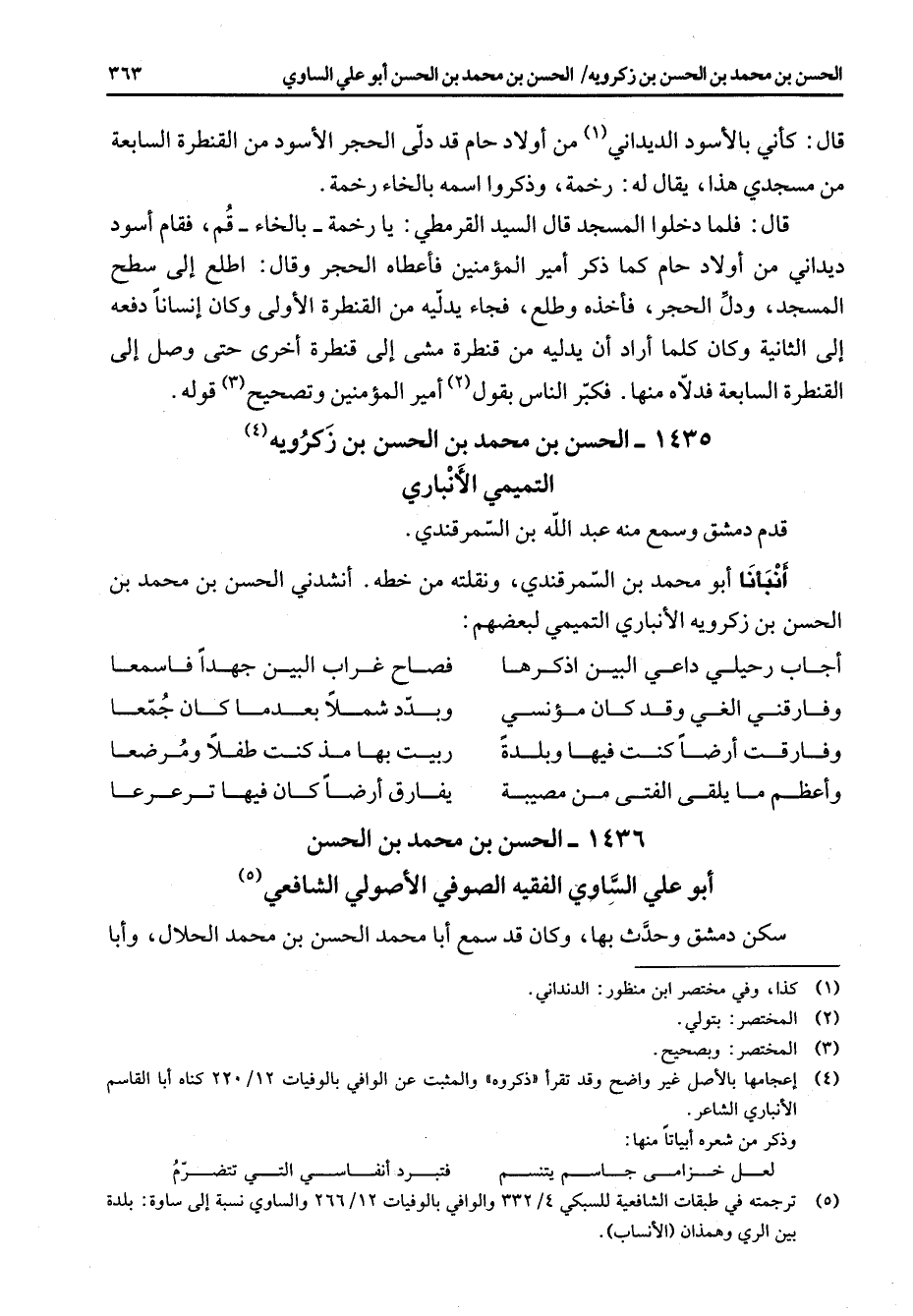 1436 - الحسن بن محمد بن الحسن أبو علي الساوي الفقيه الصوفي الاصولي الشافعي (5) سكن دمشق وحدث بها وكان قد سمع أبا محمد الحسن بن محمد الحلال وأبا