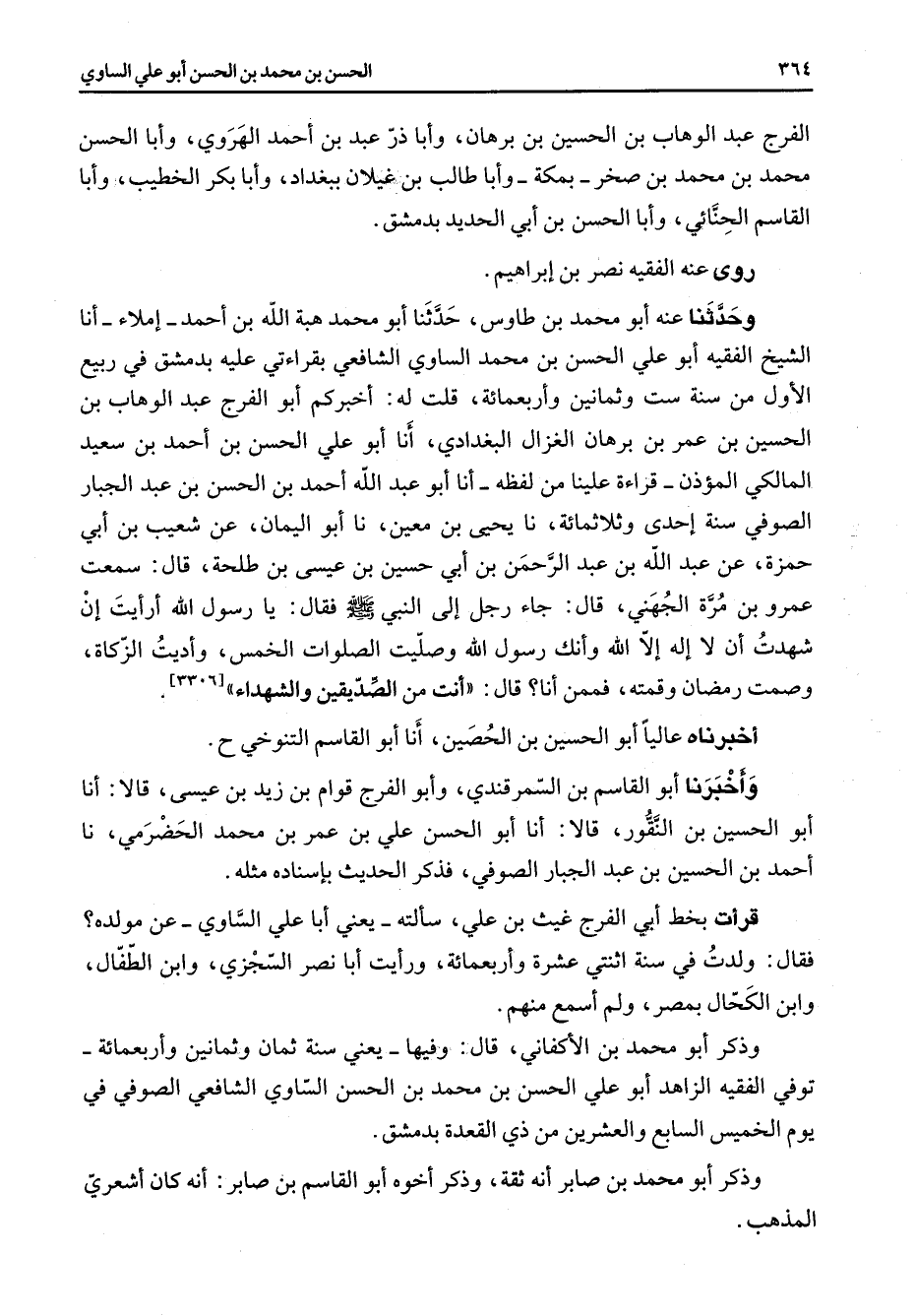 الفرج عبد الوهاب بن الحسين بن برهان وأبا ذر عبد بن احمد الهروي وأبا الحسن محمد بن محمد بن صخر بمكة وأبا طالب بن غيلان ببغداد وأبا بكر الخطيب وأبا القاسم الحنائي وأبا الحسن بن أبي الحديد بدمشق روى عنه الفقيه نصر بن إبراهيم وحدثنا عنه أبو محمد بن طاوس حدثنا أبو محمد هبة الله بن احمد إملاء أنا الشيخ الفقيه أبو علي الحسن بن محمد الساوي الشافعي بقراءتي عليه بدمشق في ربيع الأول من سنة ست وثمانين واربعمائة قلت له أخبركم أبو الفرج عبد الوهاب بن الحسين بن عمرو بن برهان الغزال البغدادي أنا أبو علي الحسن بن احمد بن سعيد المالكي المؤذن قراءة علينا من لفظه أنا أبو عبد الله احمد بن الحسن بن عبد الجبار الصوفي سنة إحدى وثلاثمائة نا يحيى بن معين نا أبو اليمان عن شعيب بن أبي حمزة عن عبد الله بن عبد الرحمن بن أبي حسين بن عيسى بن طلحة قال سمعت عمرو بن مرة الجهني قال جاء رجل إلى النبي (صلى الله عليه وسلم) فقال يا رسول الله أرأيت أن شهدت أن لا اله إلا الله وانك رسول الله وصليت الصلوات الخمس واديت الزكاة وصمت رمضان وقمته فممن أنا قال أنت من الصديقين والشهداء أخبرناه عاليا أبو الحسين بن الحصين أنا أبو القاسم التنوخي واخبرنا أبو القاسم بن السمرقندي وأبو الفرج قوام بن زيد بن عيسى قالا أنا أبو الحسين بن النقور قالا أنا أبو الحسن علي بن عمر بن محمد الحضرمي نا احمد بن الحسين بن عبد الجبار الصوفي فذكر الحديث باسناده مثله قرأت بخط أبي الفرج غيث بن علي سألته يعني أبا علي الساوي عن مولده فقال ولدت في سنة اثنتي عشرة واربعمائة ورأيت أبا نصر السجزي وابن الطفال وابن الكحال بمصر ولم اسمع منهم وذكر أبو محمد بن ألا كفاني قال وفيها يعني سنة ثمان وثمانين واربعمائة توفي الفقيه الزاهد أبو علي الحسن بن محمد بن الحسن الساوي الشافعي الصوفي في يوم الخميس السابع والعشرين من ذي القعدة بدمشق وذكر أبو محمد بن صابر انه ثقة وذكر اخوه أبو القاسم بن صابر انه كان اشعري المذهب