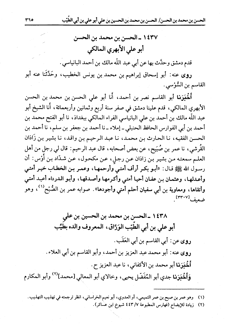 1437 - الحسن بن محمد بن الحسن أبو علي الابهري المالكي قدم دمشق وحدث بها عن أبي عبد الله مالك بن احمد البانياسي روى عنه أبو إسحاق إبراهيم بن محمد بن يونس الخطيب وحدثنا عنه أبو القاسم بن السوسي أخبرنا أبو القاسم نصر بن احمد أنا أبو علي الحسن بن محمد بن الحسن الابهري المالكي قدم علينا دمشق في صفر سنة أربع وثمانين واربعمائة أنا الشيخ أبو عبد الله مالك بن احمد بن علي البانياسي الفراء المالكي ببغداذ نا أبو الفتح محمد بن احمد بن أبي الفوارس الحافظ الحنبلي إملاء نا احمد بن جعفر بن سلم نا احمد بن الحسن الفقيه نا الحارث بن محمد نا عبد الرحيم بن واقد نا بشير بن زاذان القرشي نا عمر بن صبيح عن بعض اصحابه قال عبد الرحيم قال لي رجل من أهل العلم سمعته من بشير بن زاذان عن رجل عن مكحول عن شداد بن اوس أن رسول الله (صلى الله عليه وسلم) قال أبو بكر اراف امتي وارحمها وعمر بن الخطاب خير امتي واعدلها وعثمان بن عفان أحيا امتي واكرمها واصدقها وأبو الدرداء اعبد امتي واتقاها ومعاوية بن أبي سفيان احلم امتي واجودها صوابه عمر بن الصبح (1) وهو ضعيف