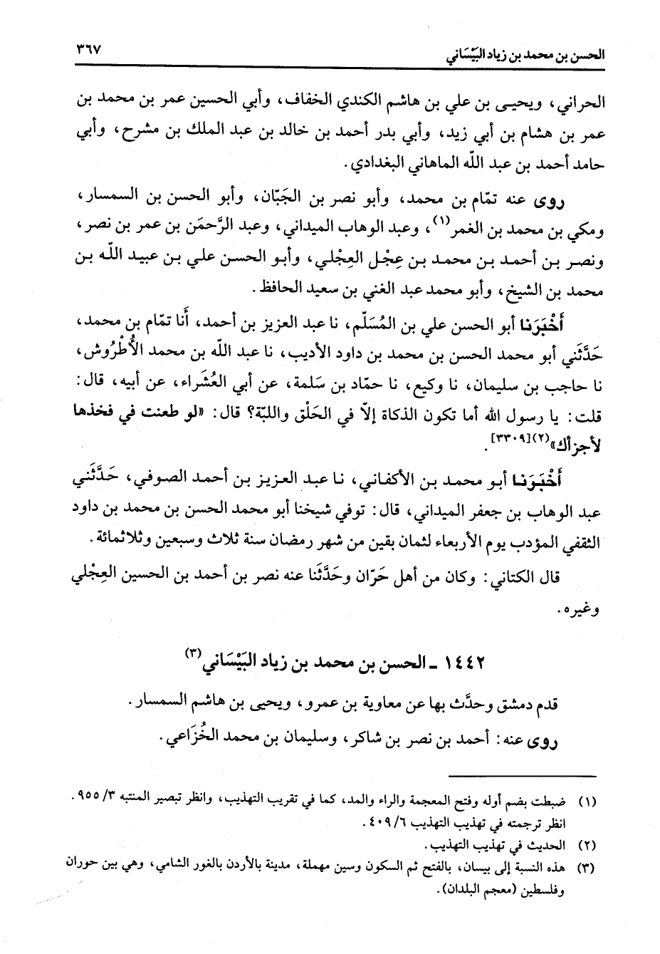 1442 - الحسن بن محمد بن زياد البيساني (3) قدم دمشق وحدث بها عن معاوية بن عمرو ويحيى بن هاشم السمسار روى عنه احمد بن نصر بن شاكر وسليمان بن محمد الخزاعي