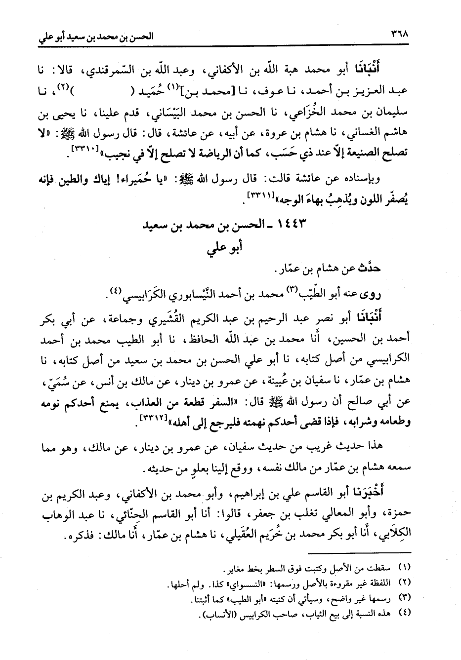 1443 - الحسن بن محمد بن سعيد أبو علي حدث عن هشام بن عمار روى عنه أبو الطيب (3) محمد بن احمد النيسابوري الكرابيسي (4)