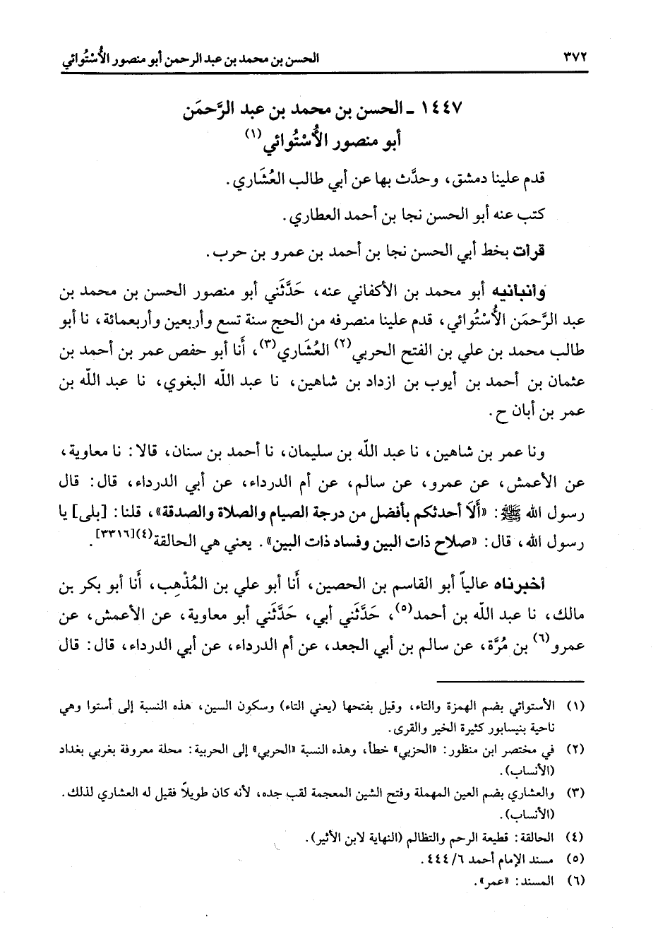 1447 - الحسن بن محمد بن عبد الرحمن أبو منصور الاستوائي (1) قدم علينا دمشق وحدث بها عن أبي طالب العشاري كتب عنه أبو الحسن نجا بن احمد العطاري قرأت بخط أبي الحسن نجا بن أحمد بن عمرو بن حرب وانبأنيه أبو محمد بن ألا كفاني عنه حدثني أبو منصور الحسن بن محمد بن عبد الرحمن الاستوائي قدم علينا منصرفه من الحج سنة تسع واربعين واربعمائة نا أبو طالب محمد بن علي بن الفتح الحربي (2) العشاري (3) أنا أبو حفص عمر بن احمد بن عثمان بن احمد بن أيوب بن ازداد بن شاهين نا عبد الله البغوي نا عبد الله بن عمر بن ابان ونا عمر بن شاهين نا عبد الله بن سليمان نا احمد بن سنان قالا نا معاوية عن الاعمش عن عمرو عن سالم عن أم الدرداء عن أبي الدرداء قال قال رسول الله (صلى الله عليه وسلم) إلا احدثكم بأفضل من درجة الصيام والصلاة والصدقة قلنا بلى يا رسول الله قال صلاح ذات البين وفساد ذات البين يعني هي الحالقة (4) أخبرناه عاليا أبو القاسم بن الحصين أنا أبو علي بن المذهب أنا أبو بكر بن مالك نا عبد الله بن احمد (5) حدثني أبي حدثني أبو معاوية عن الاعمش عن عمرو (6) بن مرة عن سالم بن أبي الجعد عن أم الدرداء عن أبي الدرداء قال قال