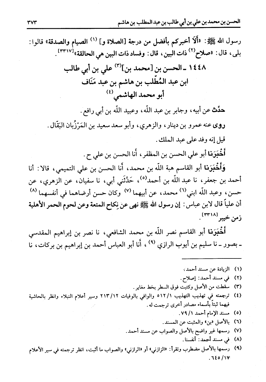 1448 - الحسن بن محمد بن (3) علي بن أبي طالب ابن عبد المطلب بن هاشم بن عبد مناف أبو محمد الهاشمي (4) حدث عن أبيه وجابر بن عبد الله وعبيد الله بن أبي رافع روى عنه عمرو بن دينار والزهري وأبو سعد سعيد بن المرزبان البقال قيل انه وفد على عبد الملك اخبرنا أبو علي الحسن بن المظفر أنا الحسن بن علي واخبرنا أبو القاسم هبة الله بن محمد أنا الحسن بن علي التميمي قالا أنا احمد بن جعفر نا عبد الله بن احمد (5) حدثني أبي نا سفيان عن الزهري عن حسن وعبد الله ابني (6) محمد عن ابيهما (7) وكان حسن ارضاهما في انفسهما (8) أن عليا قال لابن عباس أن رسول الله (صلى الله عليه وسلم) نهى عن نكاح المتعة وعن لحوم الحمر الأهلية زمن خيبر اخبرنا أبو القاسم نصر الله بن محمد الشافعي نا نصر بن إبراهيم المقدسي بصور نا سليم بن أيوب الرازي (9) أنا أبو العباس احمد بن إبراهيم بن بركات نا