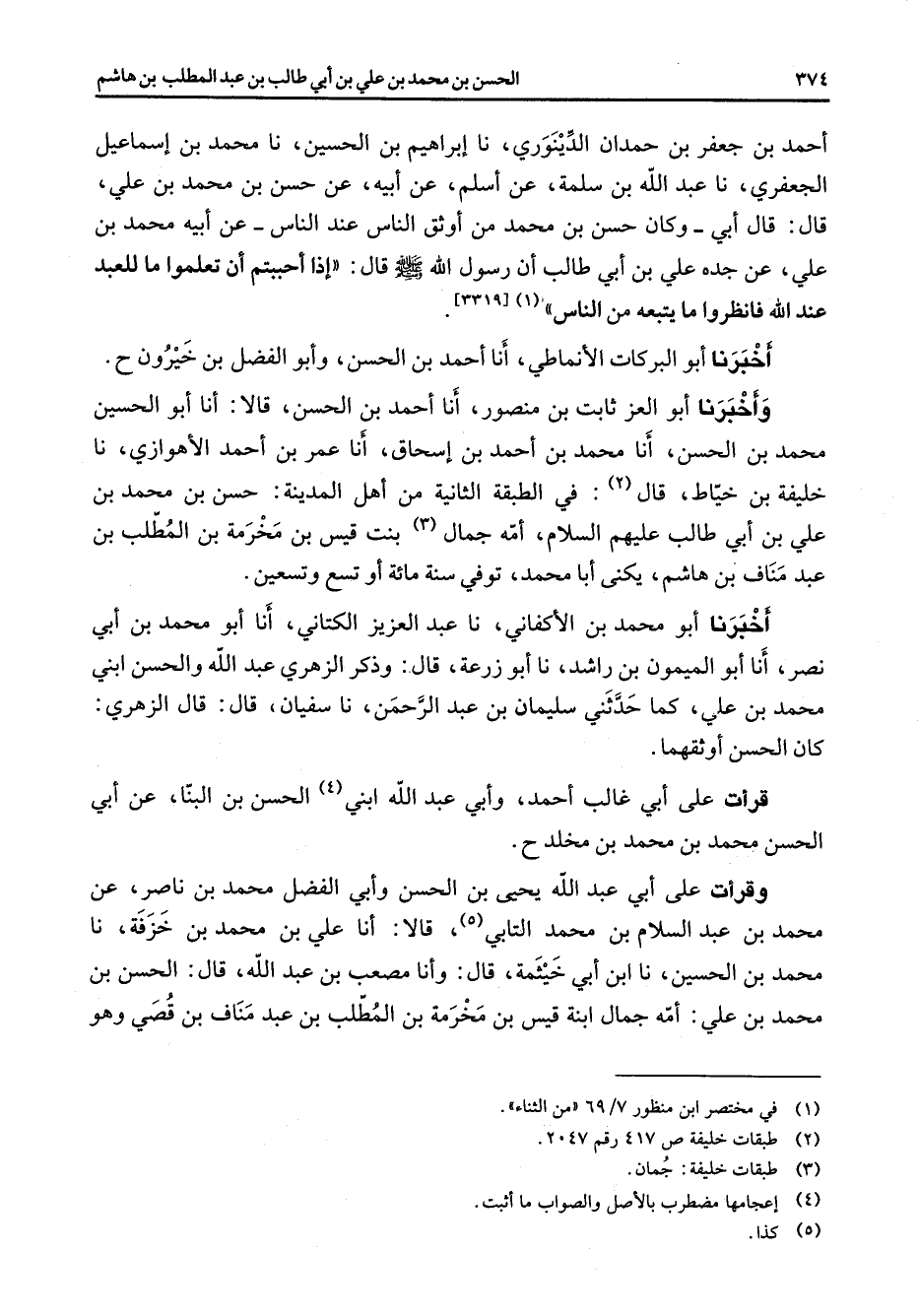 احمد بن جعفر بن حمدان الدينوري نا إبراهيم بن الحسين نا محمد بن إسماعيل الجعفري نا عبد الله بن سلمة عن اسلم عن أبيه عن حسن بن محمد بن علي قال قال أبي وكان حسن بن محمد من اوثق الناس عند الناس عن أبيه محمد بن علي عن جده علي بن أبي طالب أن رسول الله (صلى الله عليه وسلم) قال إذا احببتم أن تعلموا ما للعبد عند الله فانظروا ما يتبعه من الناس (1) اخبرنا أبو البركات الانماطي أنا احمد بن الحسن وأبو الفضل بن خيرون واخبرنا أبو العز ثابت بن منصور أنا احمد بن الحسن قالا أنا أبو الحسين محمد بن الحسن أنا محمد بن احمد بن إسحاق أنا عمر بن احمد الاهوازي نا خليفة بن خياط قال (2) : في الطبقة الثانية من أهل المدينة حسن بن محمد بن علي بن أبي طالب عليهم السلام امه جمال (3) بنت قيس بن مخرمة بن المطلب بن عبد مناف بن هاشم يكنى أبا محمد توفي سنة مائة أو تسع وتسعين اخبرنا أبو محمد بن ألا كفاني نا عبد العزيز الكتاني أنا أبو محمد بن أبي نصر أنا أبو الميمون بن راشد نا أبو زرعة قال وذكر الزهري عبد الله والحسن ابني محمد بن علي كما حدثني سليمان بن عبد الرحمن نا سفيان قال قال الزهري كان الحسن اوثقهما قرأت على أبي غالب احمد وأبي عبد الله ابني (4) الحسن بن البنا عن أبي الحسن محمد بن محمد بن مخلد وقرأت على أبي عبد الله يحيى بن الحسن وأبي الفضل محمد بن ناصر عن محمد بن عبد السلام بن محمد بن التابي (5) قالا أنا علي بن محمد بن خزفة نا محمد بن الحسين نا ابن أبي خيثمة قال وأنا مصعب بن عبد الله قال الحسن بن محمد بن علي امه جمال ابنة قيس بن مخرمة بن المطلب بن عبد مناف بن قصي وهو