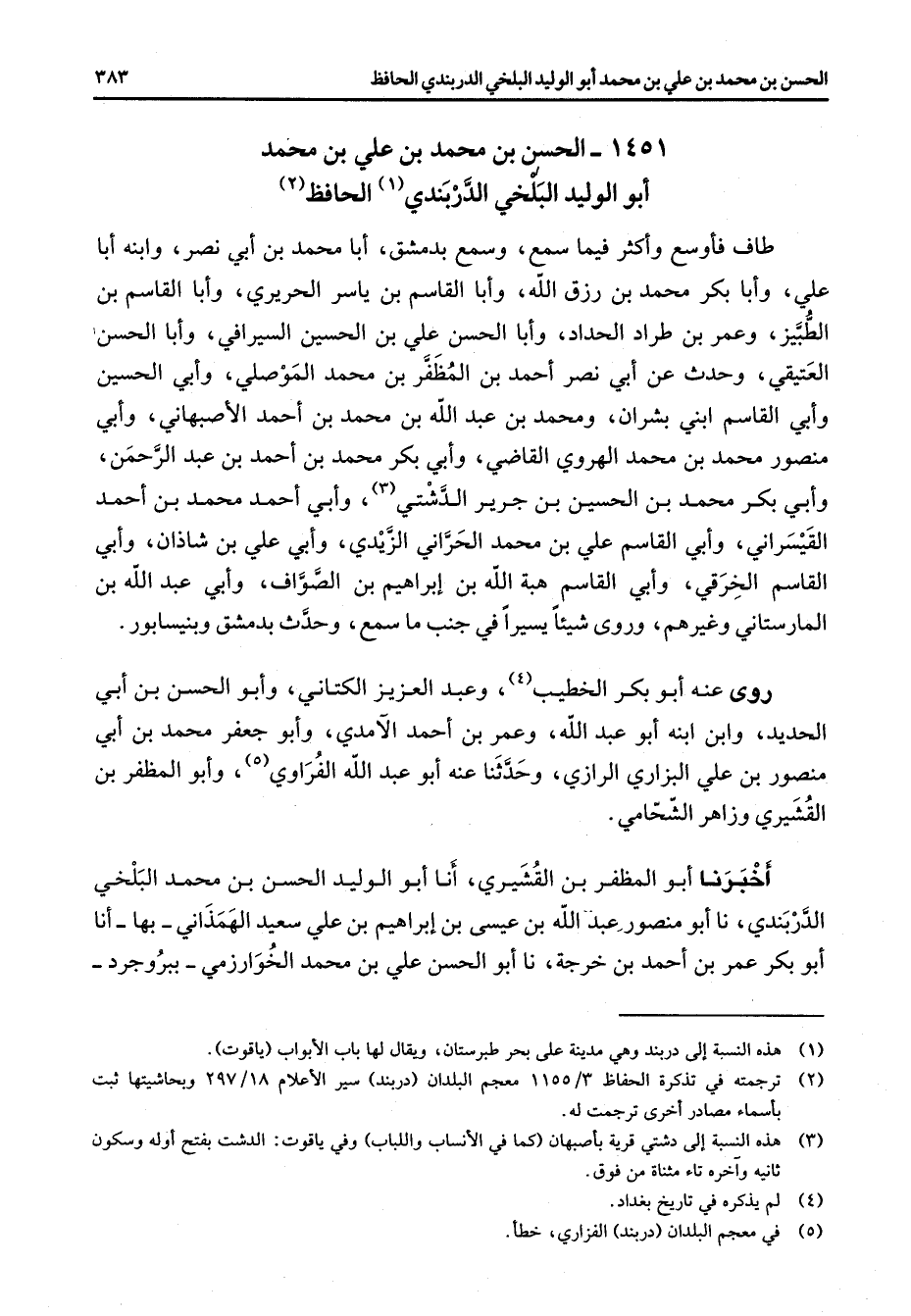 1451 - الحسن بن محمد بن علي بن محمد أبو الوليد البلخي الدربندي (1) الحافظ (2) طاف فأوسع واكثر فيما سمع وسمع بدمشق أبا محمد بن أبي نصر وابنه أبا علي وأبا بكر محمد بن رزق الله وأبا القاسم بن ياسر الحريري وأبا القاسم بن ياسر الحريري وأبا القاسم بن الطبيز وعمر بن طراد الحداد وأبا الحسن علي بن الحسين السيرافي وأبا الحسن العتيقي وحدث عن أبي نصر احمد بن المظفر بن محمد الموصلي وأبي الحسين وأبي القاسم ابني بشران ومحمد بن عبد الله بن محمد بن احمد الاصبهاني وأبي منصور محمد بن محمد الهروي القاضي وأبي بكر محمد بن احمد بن عبد الرحمن وأبي بكر محمد بن الحسين بن جرير الدشتي (3) وأبي احمد محمد بن احمد القيسراني وأبي القاسم علي بن محمد الحراني الزيدي وأبي علي بن شاذان وأبي القاسم الخرقي وأبي القاسم هبة الله بن إبراهيم بن الصواف وأبي عبد الله بن المارستاني وغيرهم وروى شيئا يسيرا في جنب ما سمع وحدث بدمشق وبنيسابور روى عنه أبو بكر الخطيب (4) وعبد العزيز الكتاني وأبو الحسن بن أبي الحديد وابن ابنه أبو عبد الله وعمر بن احمد الامدي وأبو جعفر محمد بن أبي منصور بن علي البزاري الرازي وحدثنا عنه أبو عبد الله الفراوي (5) وأبو المظفر بن القشيري وزاهر الشحامي خبرنا أبو المظفر بن القشيري أنا أبو الوليد الحسن بن محمد البلخي الدربندي نا أبو منصور عبد الله بن عيسى بن إبراهيم بن علي سعيد الهمذاني بها أنا أبو بكر عمر بن احمد بن خرجة نا أبو الحسن علي بن محمد الخوارزمي ببروجرد